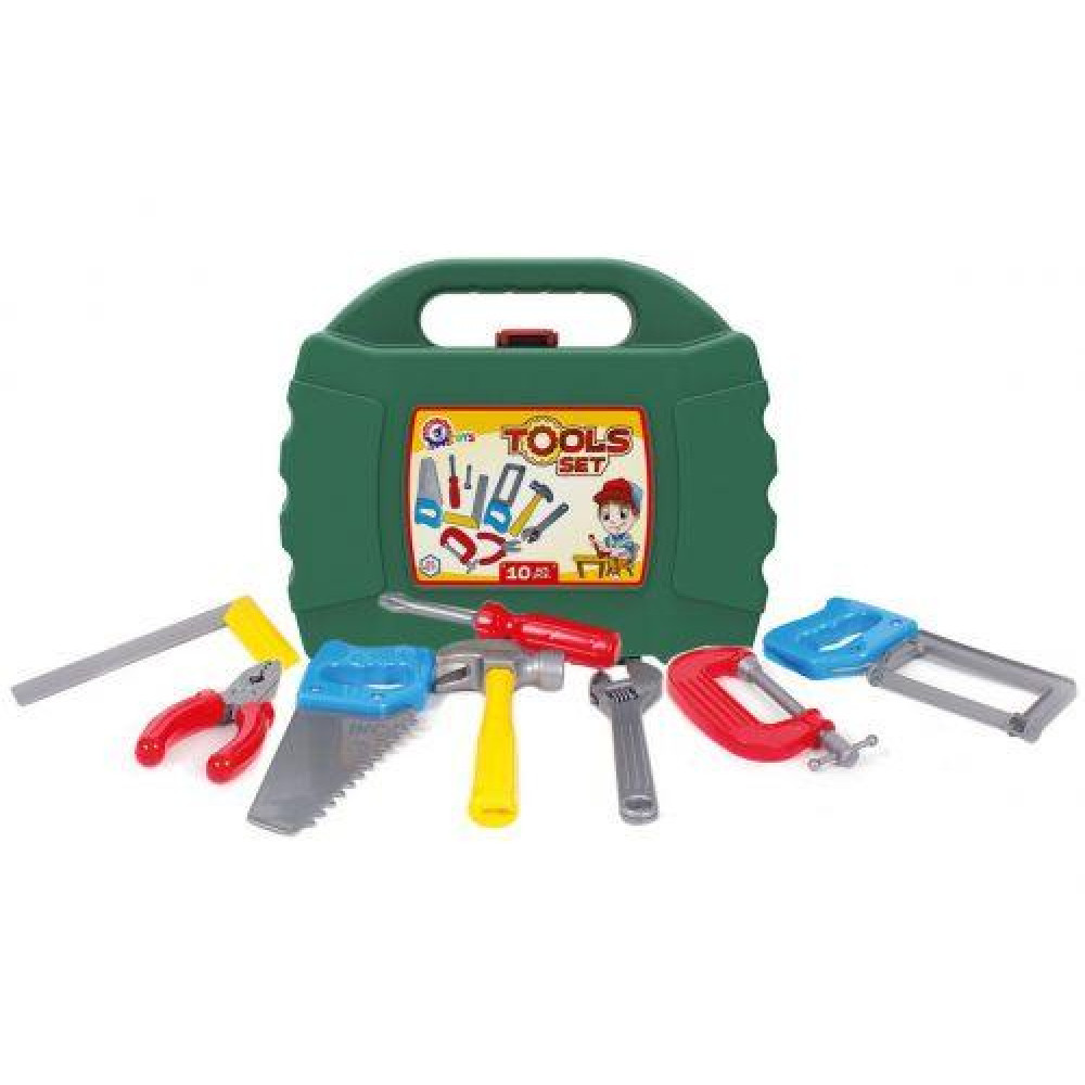 10 шт. инструментов: молоток, 2 пилы, отвёртка с 2мя насадками, разводной ключ, плоскогубцы, струбцина, угольник |