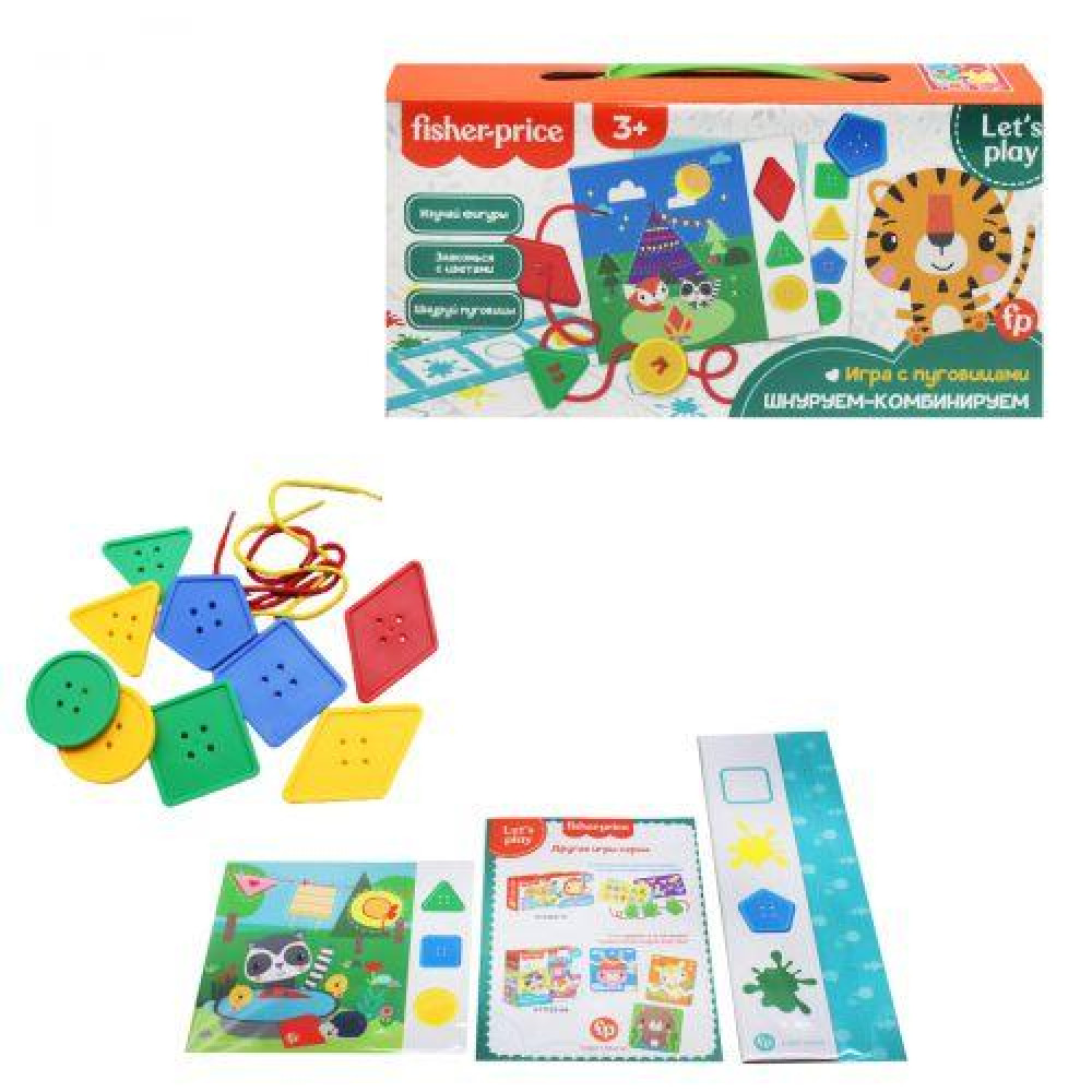 12 карточек с заданиями, 10 пластиковых пуговичек, 1 комбинатор, 2 шнурочка, 1 инструкция |