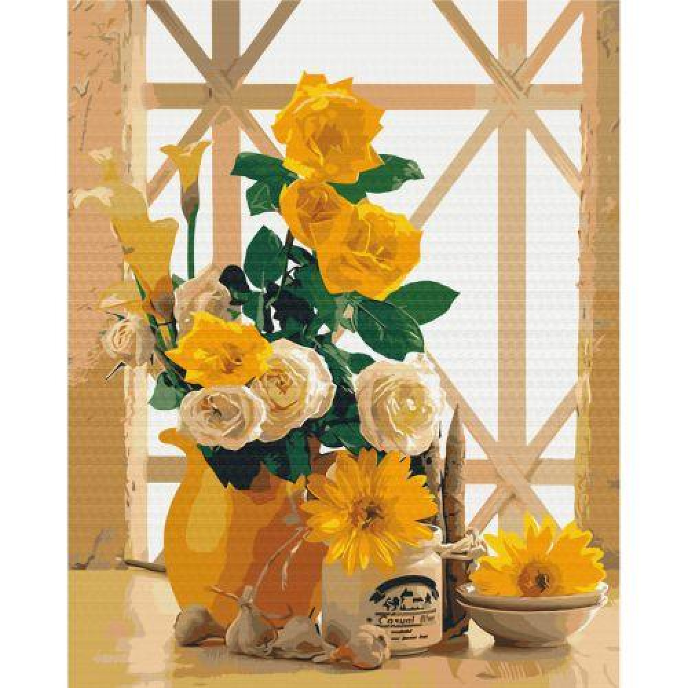 Холст на подрамнике с галерейной натяжкой, бумажная инструкция с контурным рисунком картины, нейлоновые кисти, палитра акриловых красок в контейнерах, крепление |