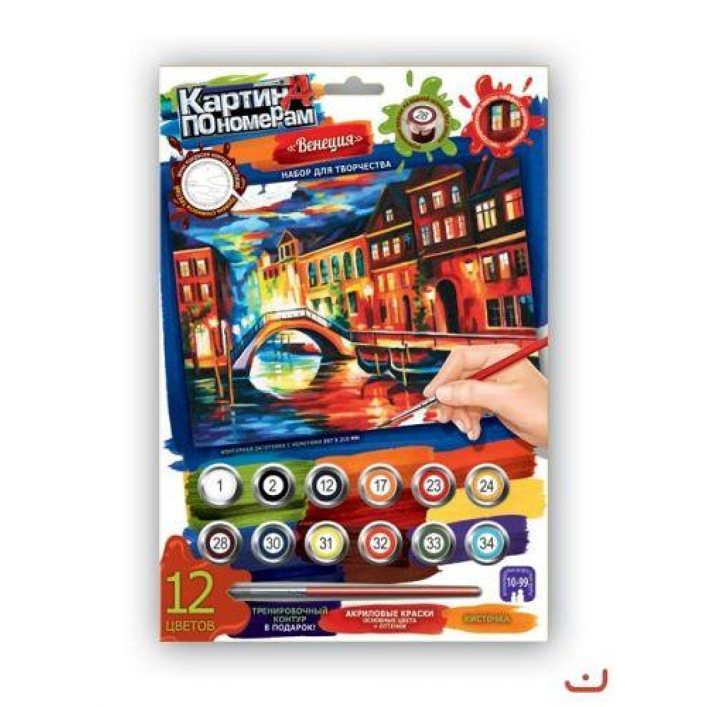 12 акриловых красок, кисточка, контурная заготовка 2 шт., инструкция |