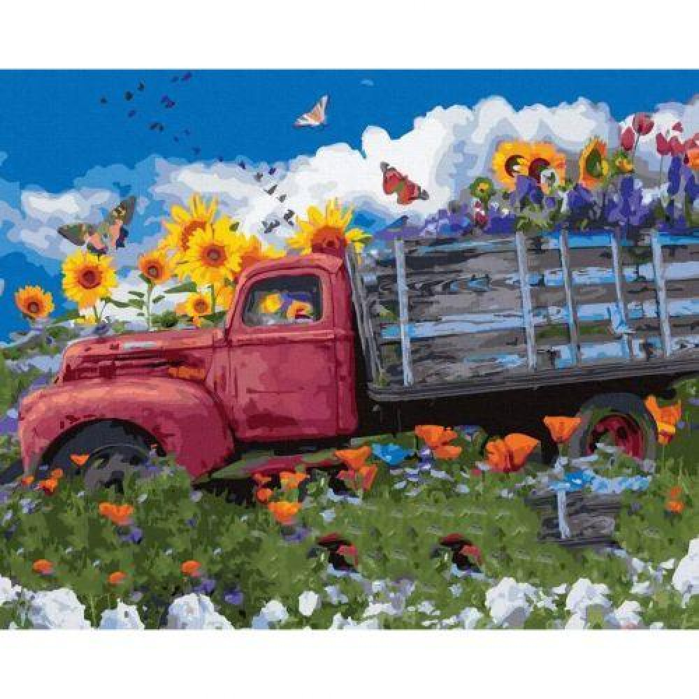 Натуральный холст на подрамнике с галерейной натяжкой, бумажная копия с контурным рисунком картины (на картине нанесена схема контуров изображения с нумерацией), нейлоновые художественные кисти, палитра акриловых красок в контейнерах, крепление |