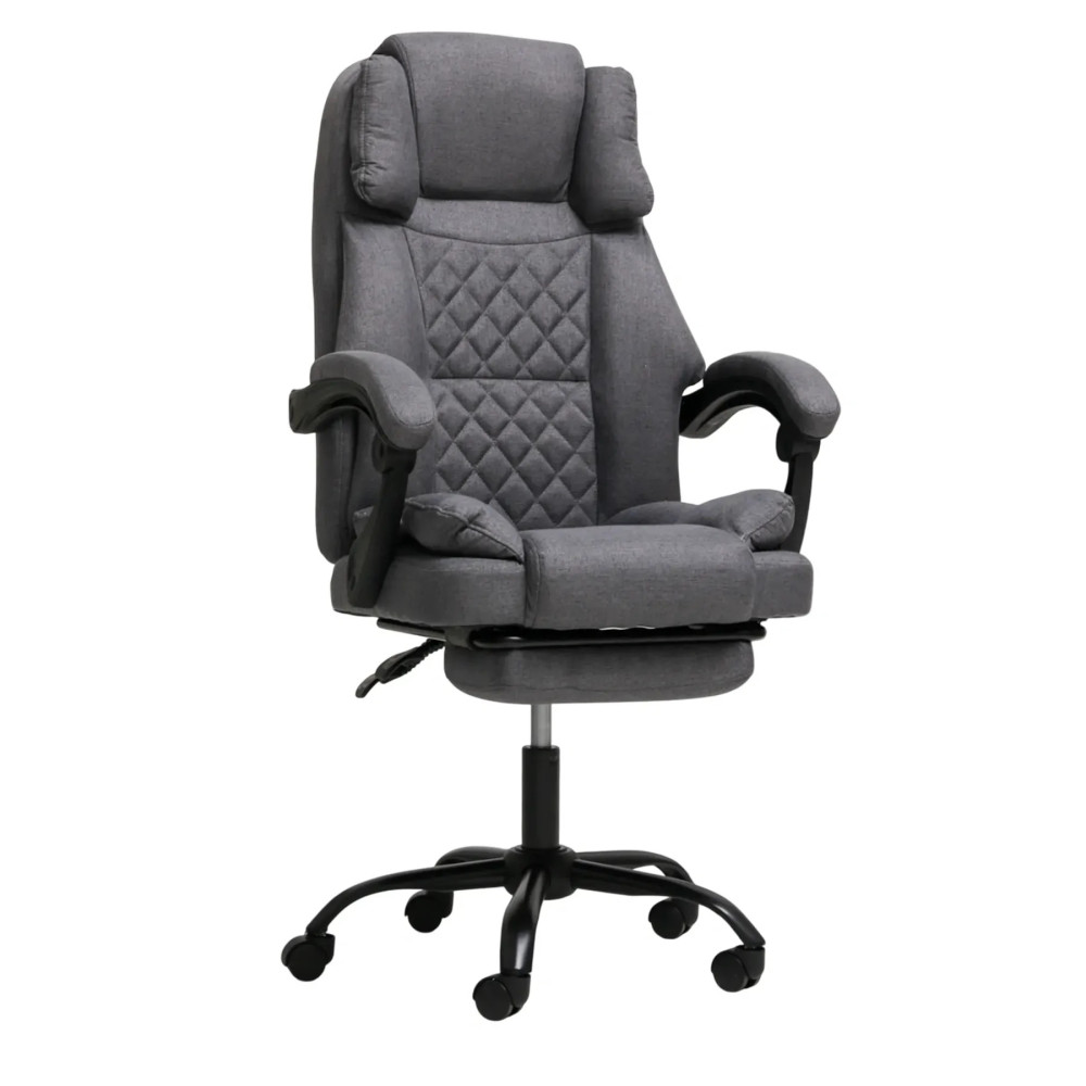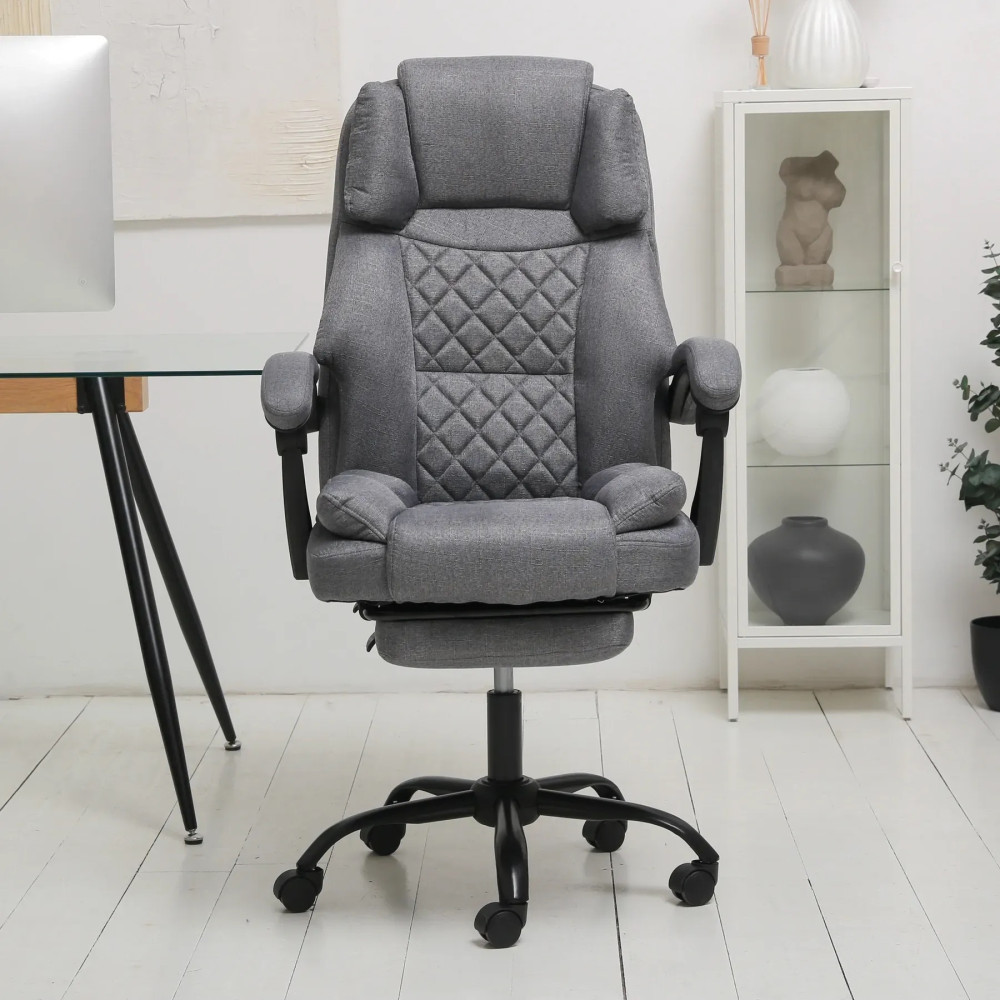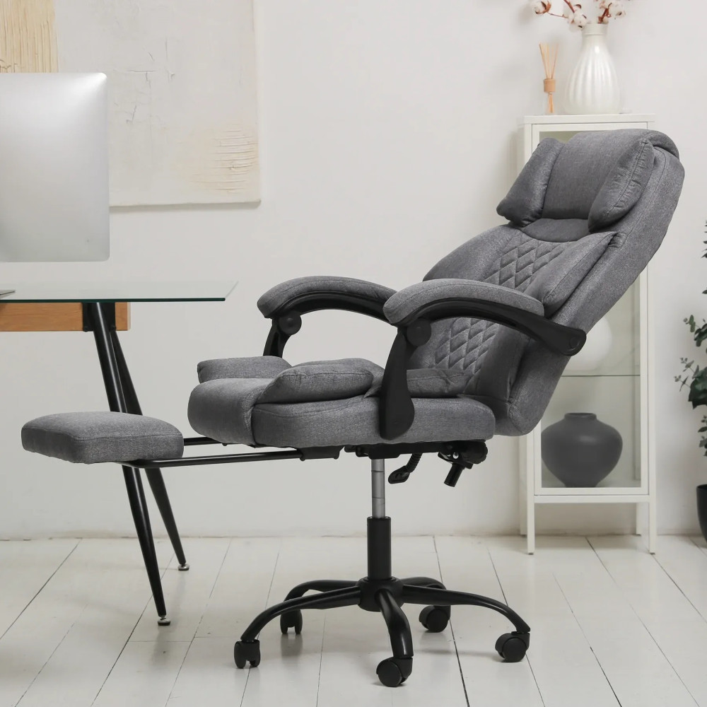 Кресло оснащено подушкой под голову и поддержкой поясницы, откидной спинкой с фиксатором и выдвижной подставкой для ног, чтобы рабочее место в любой момент превращалось в удобную зону отдыха. Мягкие подлокотники добавляют комфорта, а ткань легко очищается и сохраняет презентабельный вид даже после длительного использования.