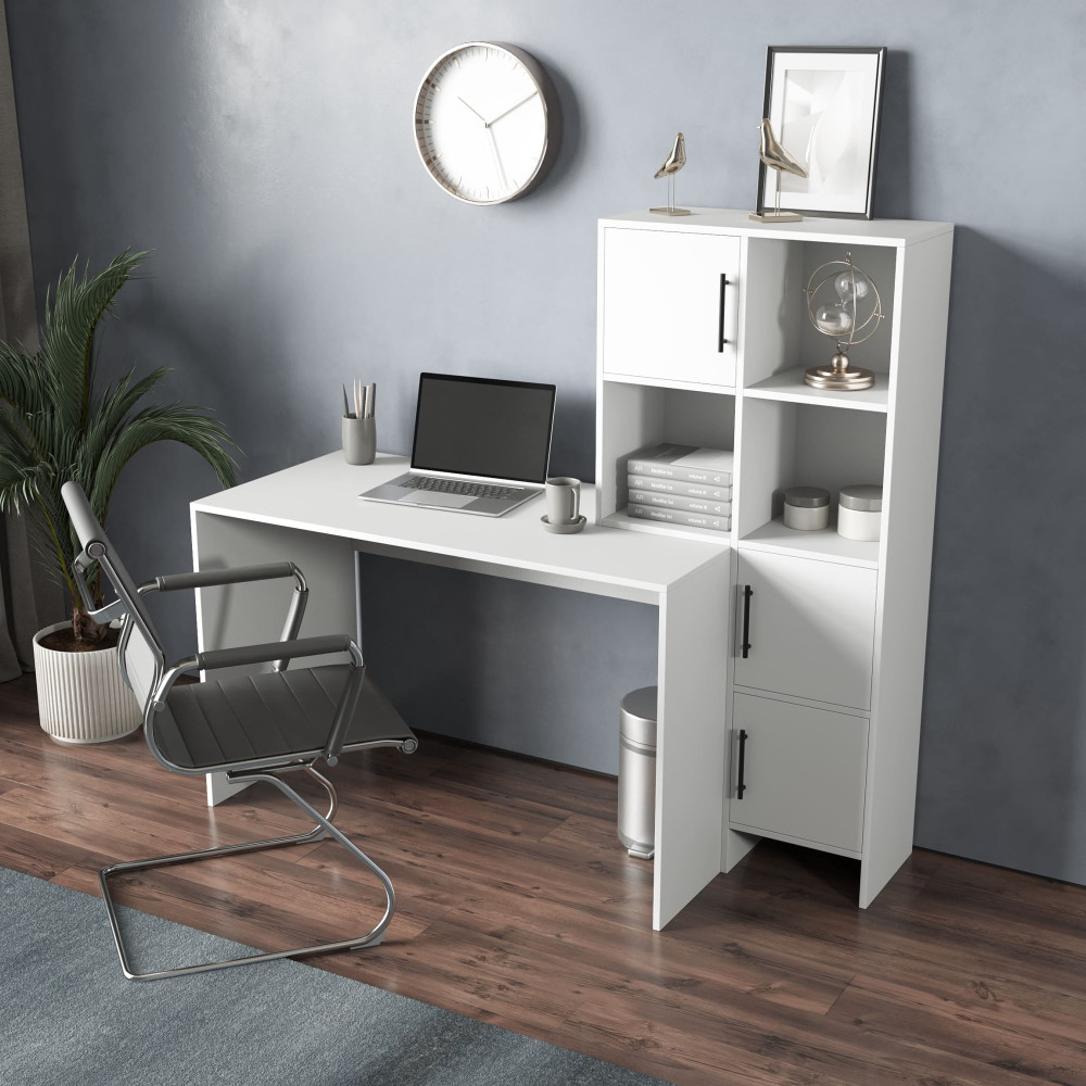 Компьютерный стол письменный со стеллажом с дверками Белый