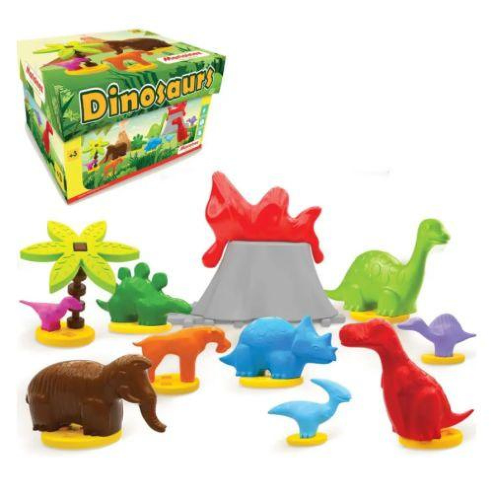 6 динозавров, 1 мамонт, 1 саблезубый тигр, 1 пальма, 1 вулкан. |