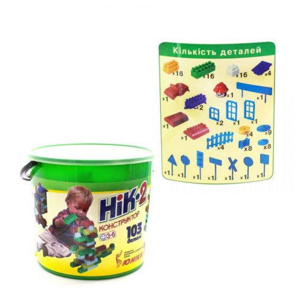 Яркий пластиковый конструктор на 103 детали. Кроме обычных блоков набор состоит из деталей для постройки машинки, домика и нескольких дорожных знаков. В качестве упаковки - пластиковое ведёрко с ручкой.