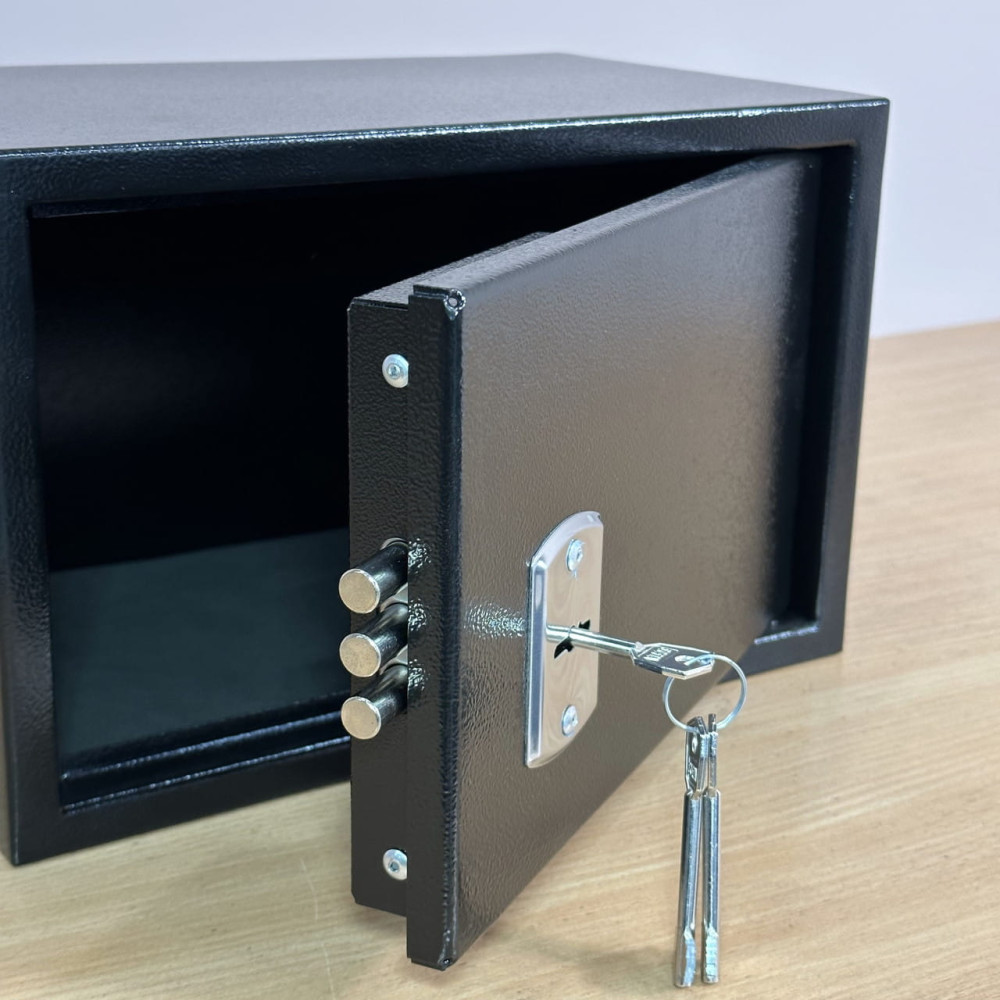 Сейф закрывается ключевым сувальдным замком, управляющим тремя круглыми ригелями.