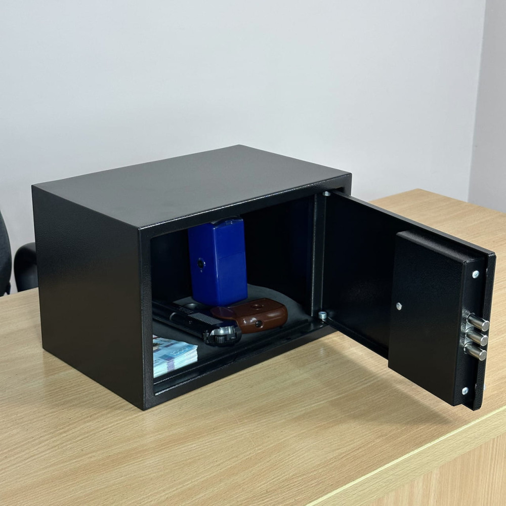 Покрыт порошковой краской черного цвета, которая придает дополнительную защиту от коррозии. Сейф отлично дополнит любое современное помещение.
