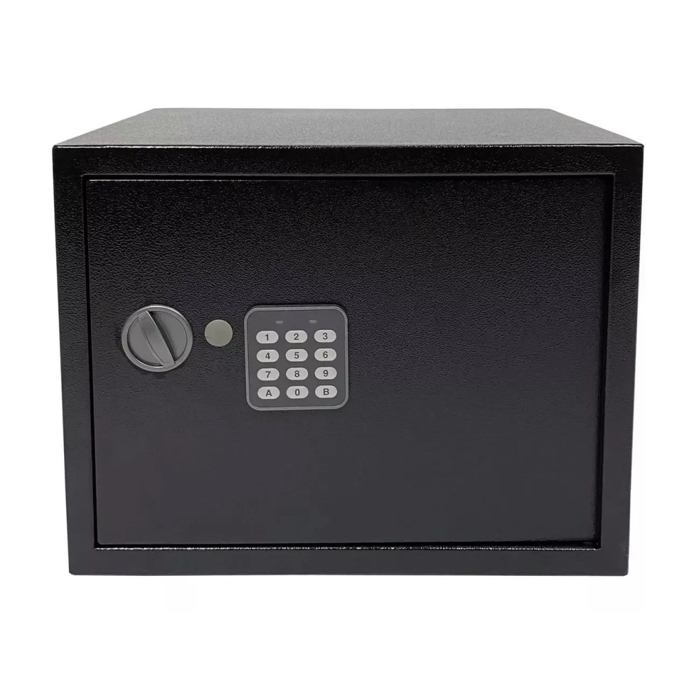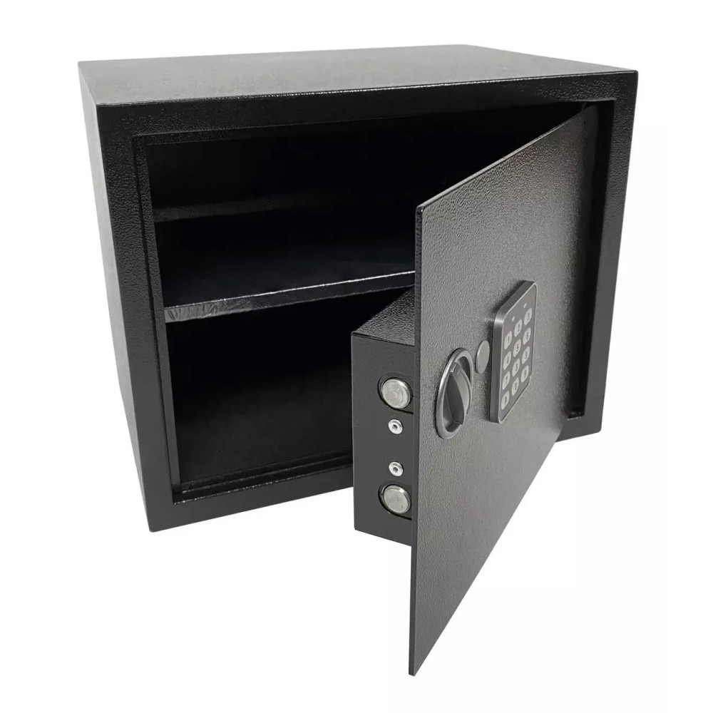 Покрыт порошковой краской черного цвета, которая придает дополнительную защиту от коррозии. Сейф отлично дополнит любое современное помещение.