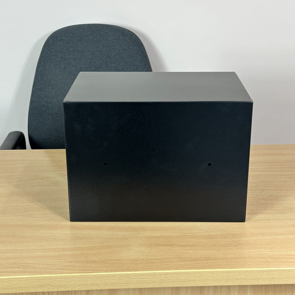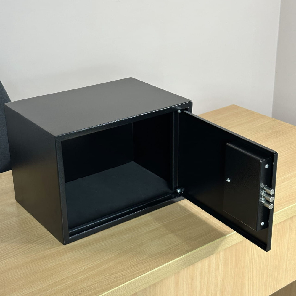 Покрыт порошковой краской черного цвета, которая придает дополнительную защиту от коррозии. Сейф отлично дополнит любое современное помещение.