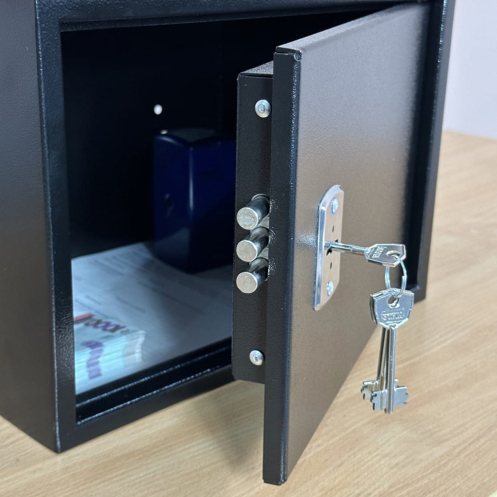 Сейф закрывается ключевым сувальдным замком, управляющим тремя круглыми ригелями.