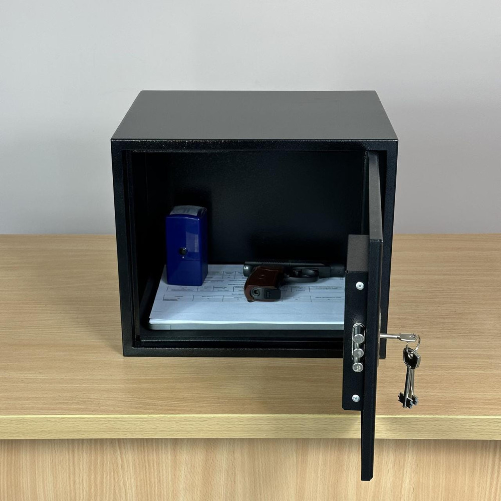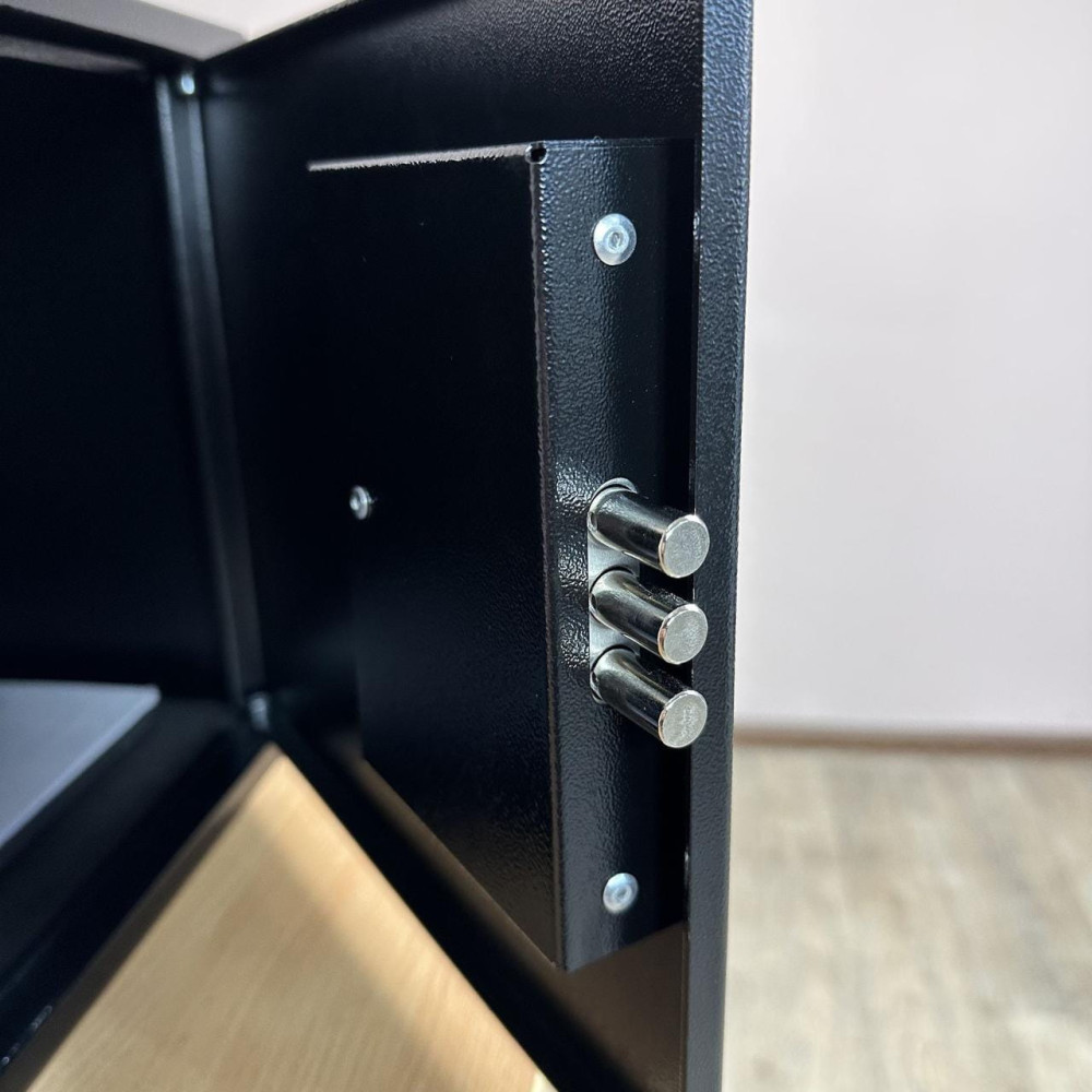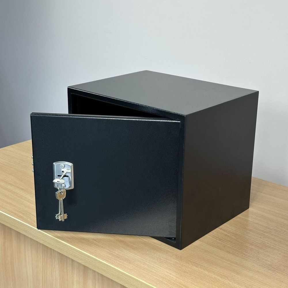 Покрыт порошковой краской черного цвета, которая придает дополнительную защиту от коррозии. Сейф отлично дополнит любое современное помещение.