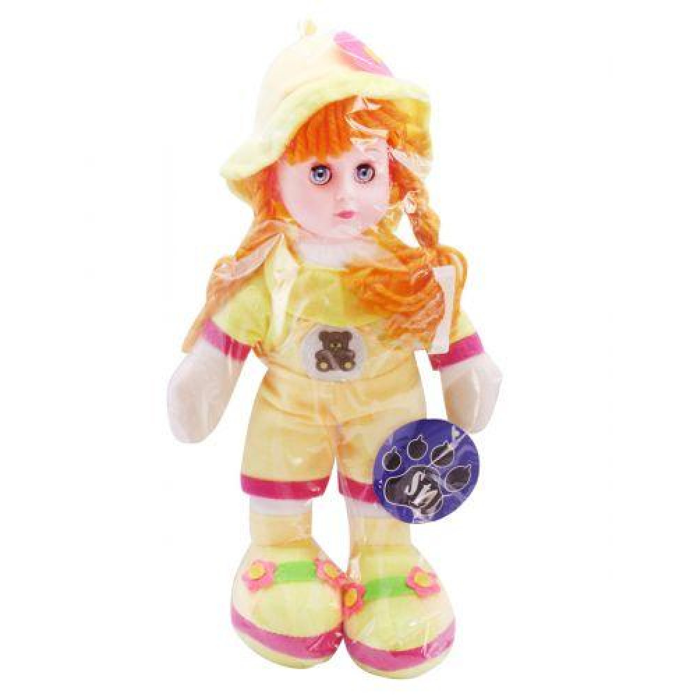 Кукла мягкая, музыкальная, 30 см. Рассказывает стишок, на русском языке. Открывает и закрывает глазки. В шапочке.