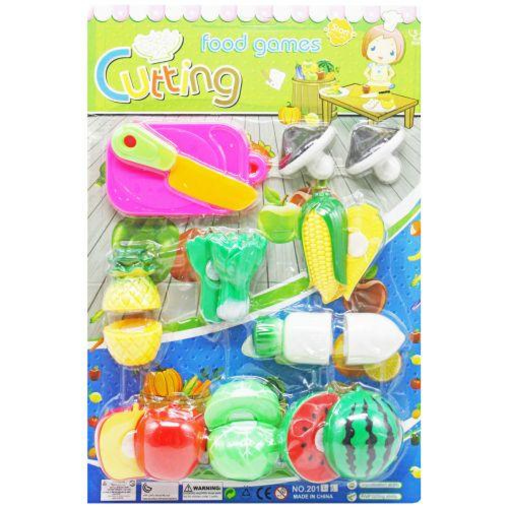 Овощи и фрукты (апельсин, помидор, чеснок, сладкий перец, кукуруза, клубника, брокколи, лимон, дыня) досточка для нарезания и нож. |