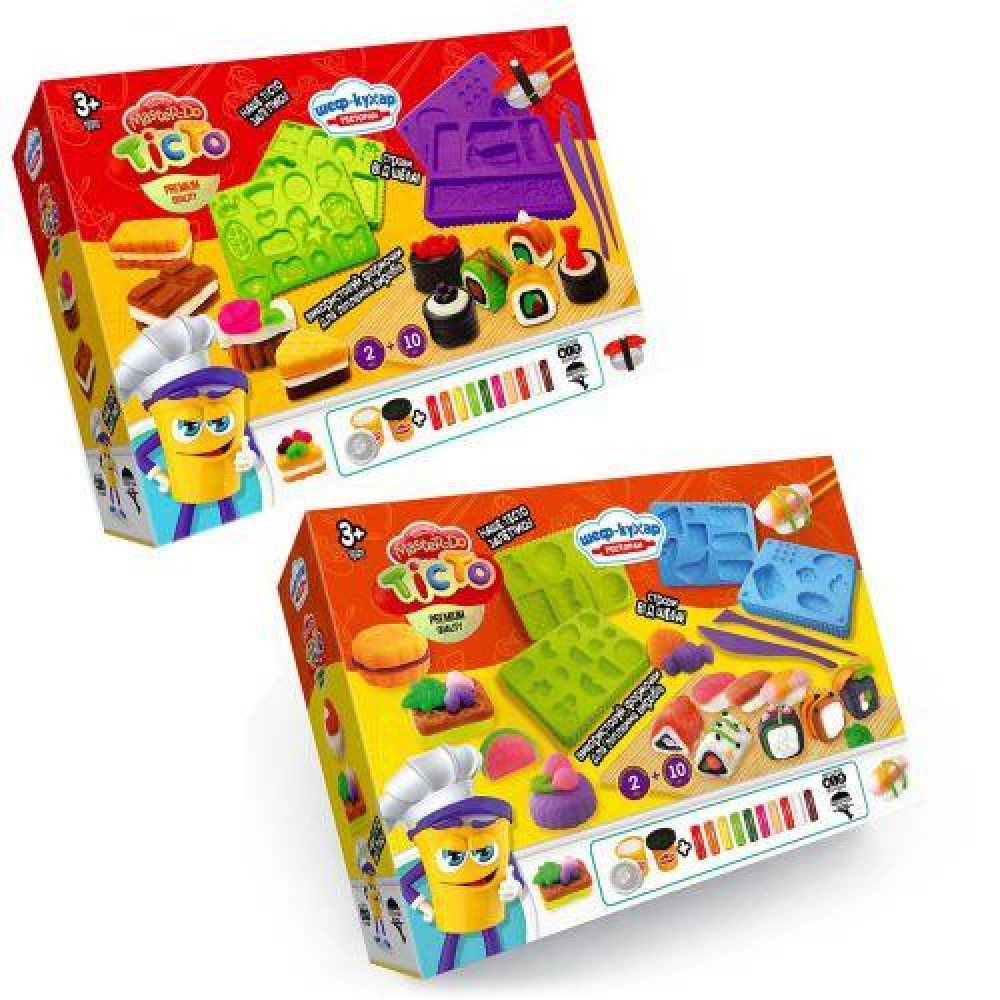 Тесто для лепки - 10 брикетов, тесто для лепки - 2 баночки, формочки для лепки - 4 шт., комплект стеков, коврик - 1 шт, палочки для суши, инструкция - 1 шт. |