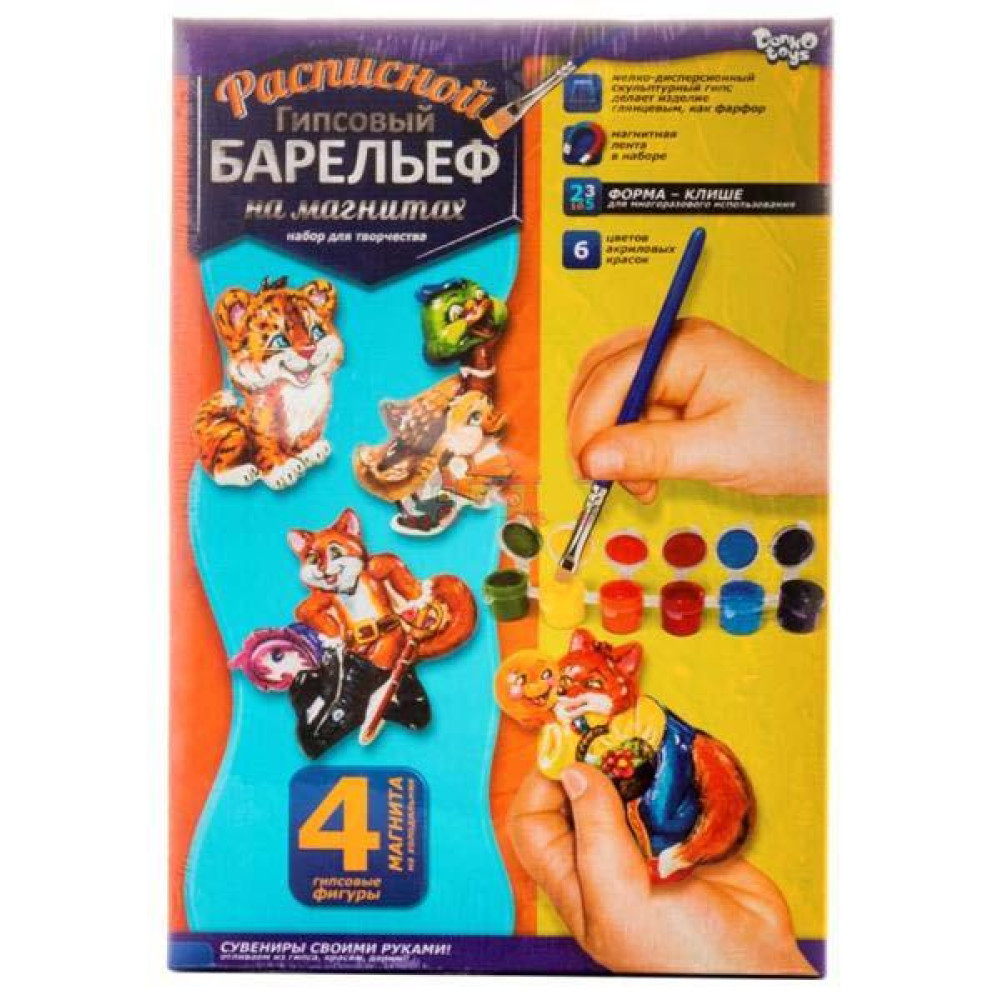 Форма для 4-х фигур, гипсовый порошок, 6 цветов краски, кисточка, магнитная лента, инструкция |