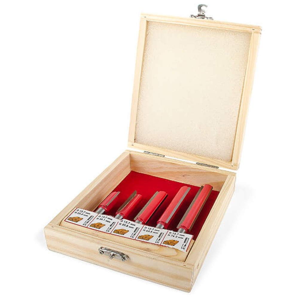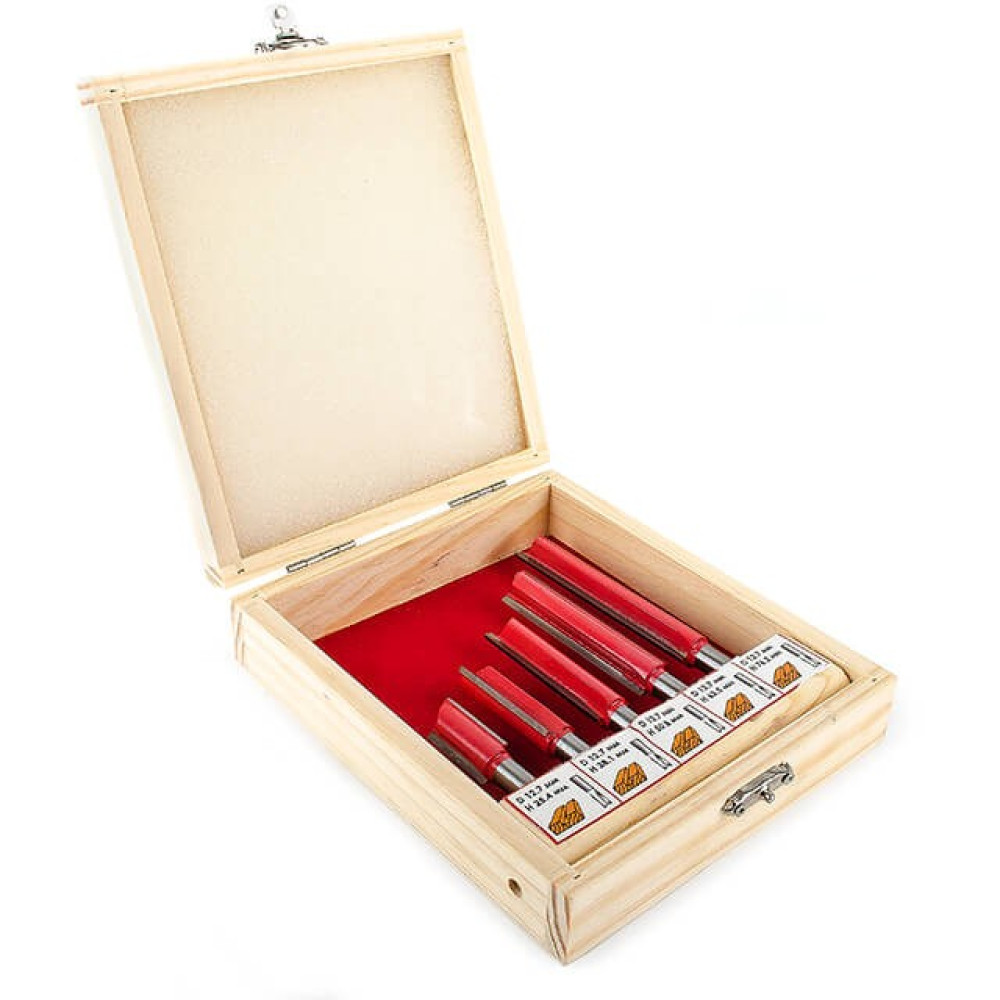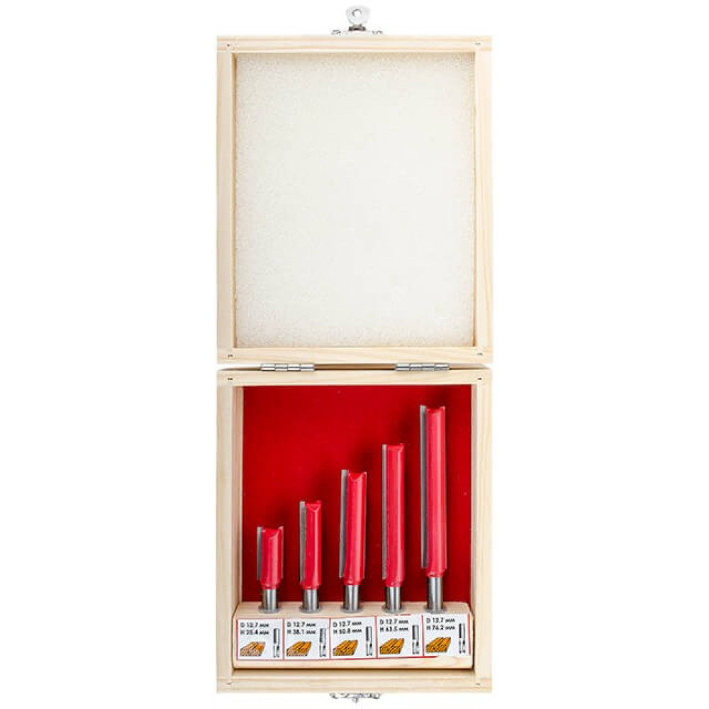 В наборе HT-0075 представлены 5 фрез разной длины. Это прямые пазовые фрезы, которые предназначены для изготовления прямых пазов различной ширины и глубины, а также для сквозного отверстия. Прямые пазовые фрезы как в наборе HT-0075 используются для прорезания шпоночных отверстий для дверей или для окон. Также, эти фрезы используются для двойного шпунтового соединения, шипового потайного или полупотайного соединения и др. Все фрезы укомплектованы в специальный деревянный кейс, который удобен как для хранения, так и для транспортировки.