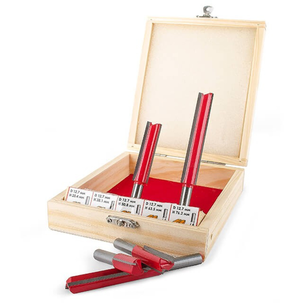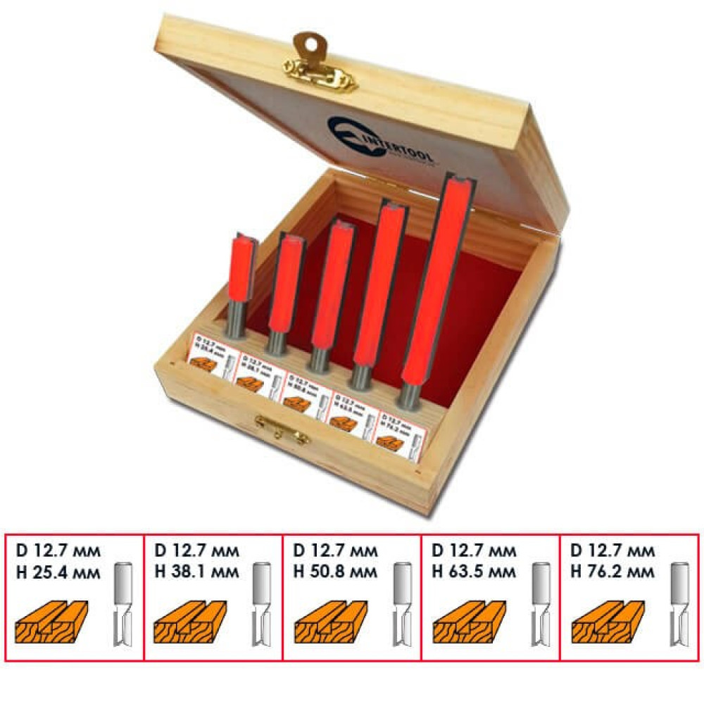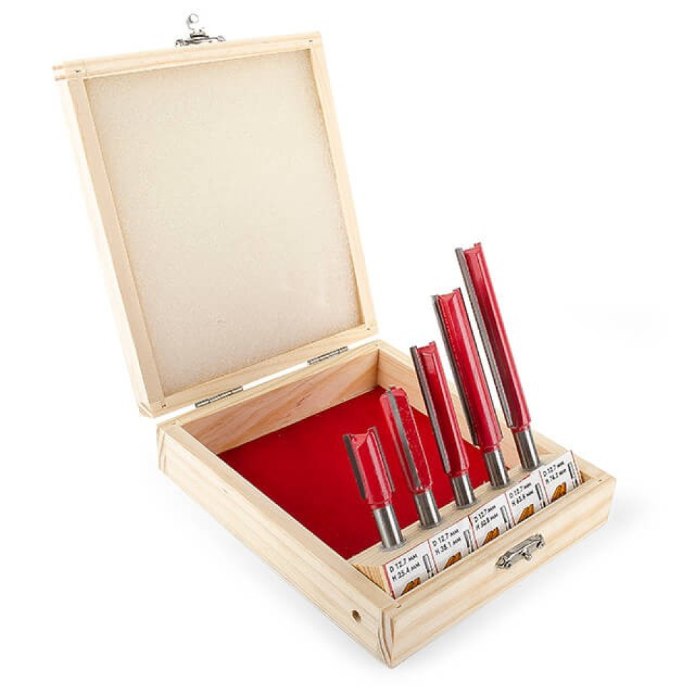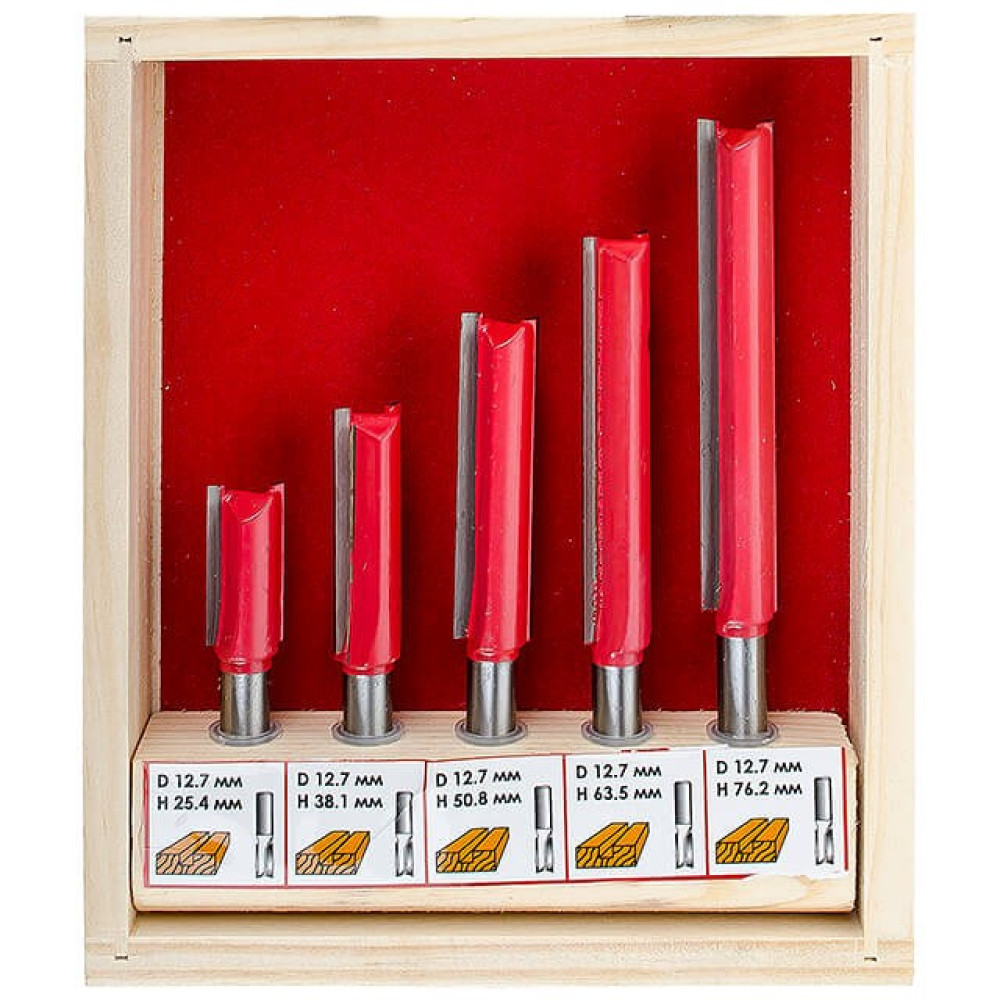В наборе HT-0075 представлены 5 фрез разной длины. Это прямые пазовые фрезы, которые предназначены для изготовления прямых пазов различной ширины и глубины, а также для сквозного отверстия. Прямые пазовые фрезы как в наборе HT-0075 используются для прорезания шпоночных отверстий для дверей или для окон. Также, эти фрезы используются для двойного шпунтового соединения, шипового потайного или полупотайного соединения и др. Все фрезы укомплектованы в специальный деревянный кейс, который удобен как для хранения, так и для транспортировки.