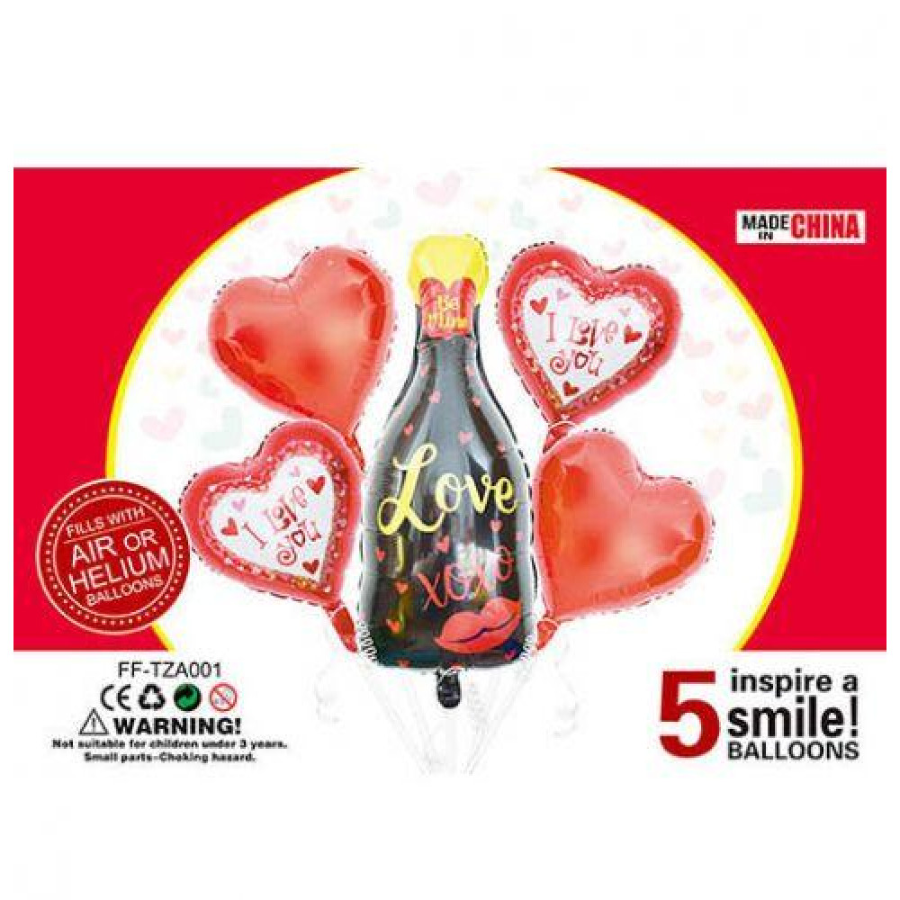 Яркий набор шариков "Шампанское". Милый и красочный комплект. В наборе 5 фольгированных шариков: 1 большой шарик в виде бутылки шампанского, 2 в виде сердечек. Все шарики качественные и надежные.
