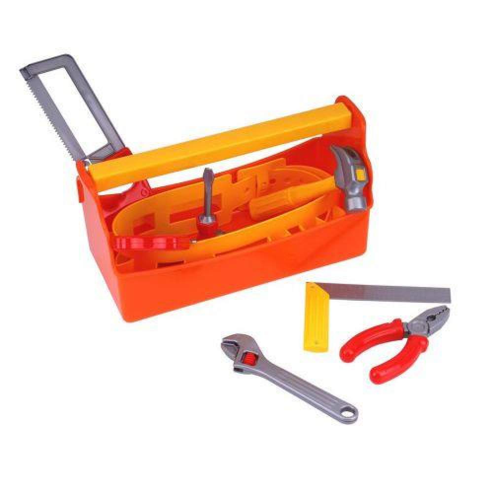 Органайзер, плоскогубцы, кутник, молоток, пилкиапо дереву, пилка по металлу, разводной ключ, 2 насадки для отвертки, ручка отвертки, пояс, коробка |