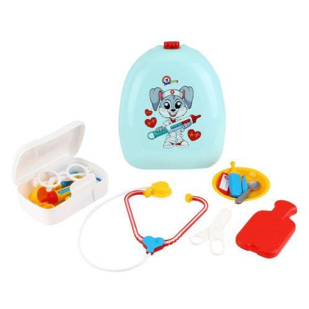 Рюкзак, стетоскоп, градусник, шприц, щипцы, грелка, ножницы, молоточек, бейджик, очки, тарелочка, ложка, аптечка. |