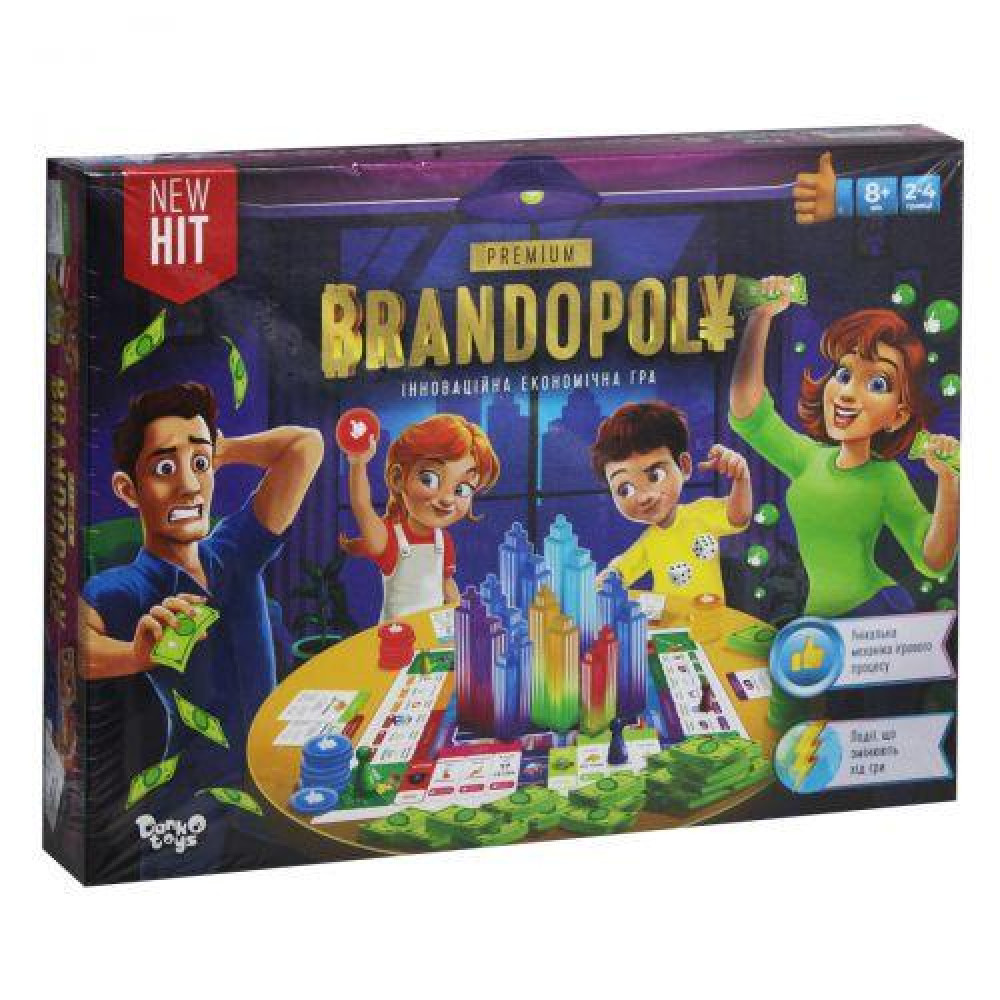 24 карточки брендов, 225 денежных купюр, 32 карточки случайных событий, 100 фишек популярности, 4 фишки игроков, 2 кубика, игровое поле. |