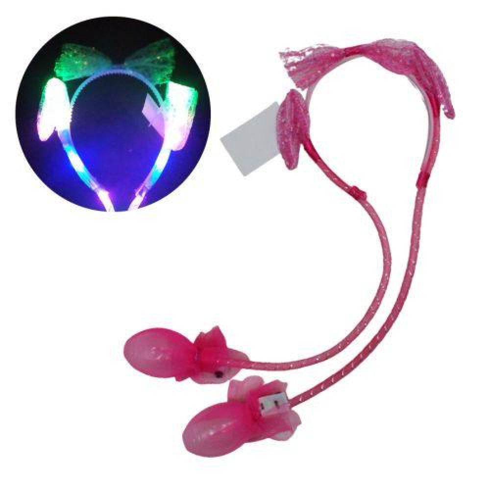 Веселые ушки зайки станут приятным подарком. Секрет игрушки – в насосах (грушах), скрытых на концах завязок. При нажатии на эти груши – ушки поднимаются. Сделаны в виде обруча с диаметром 13 см. Длина – 50 см. Оснащены приятной подсветкой (3 режима).