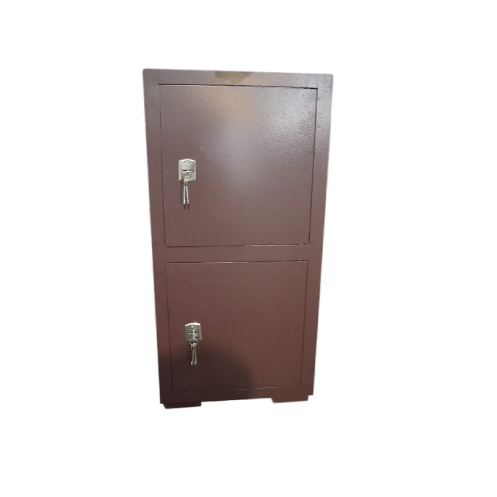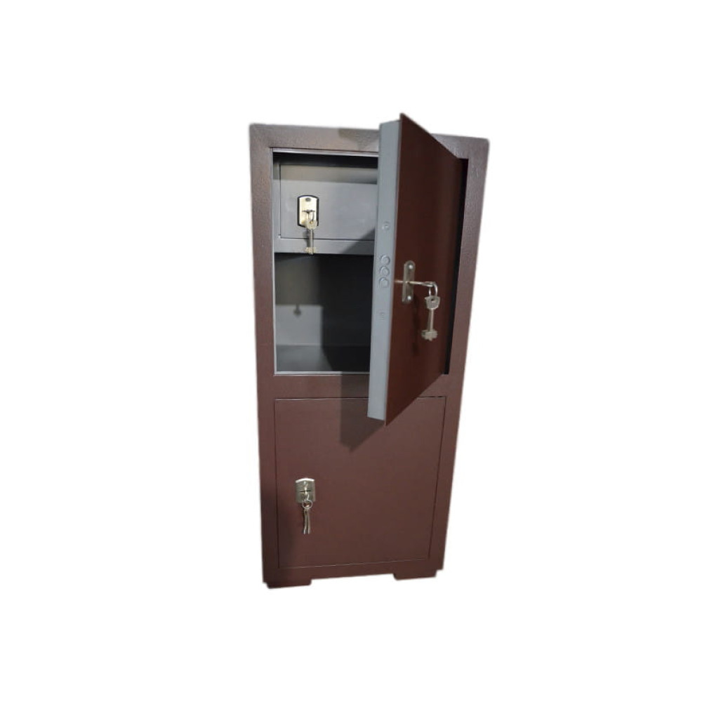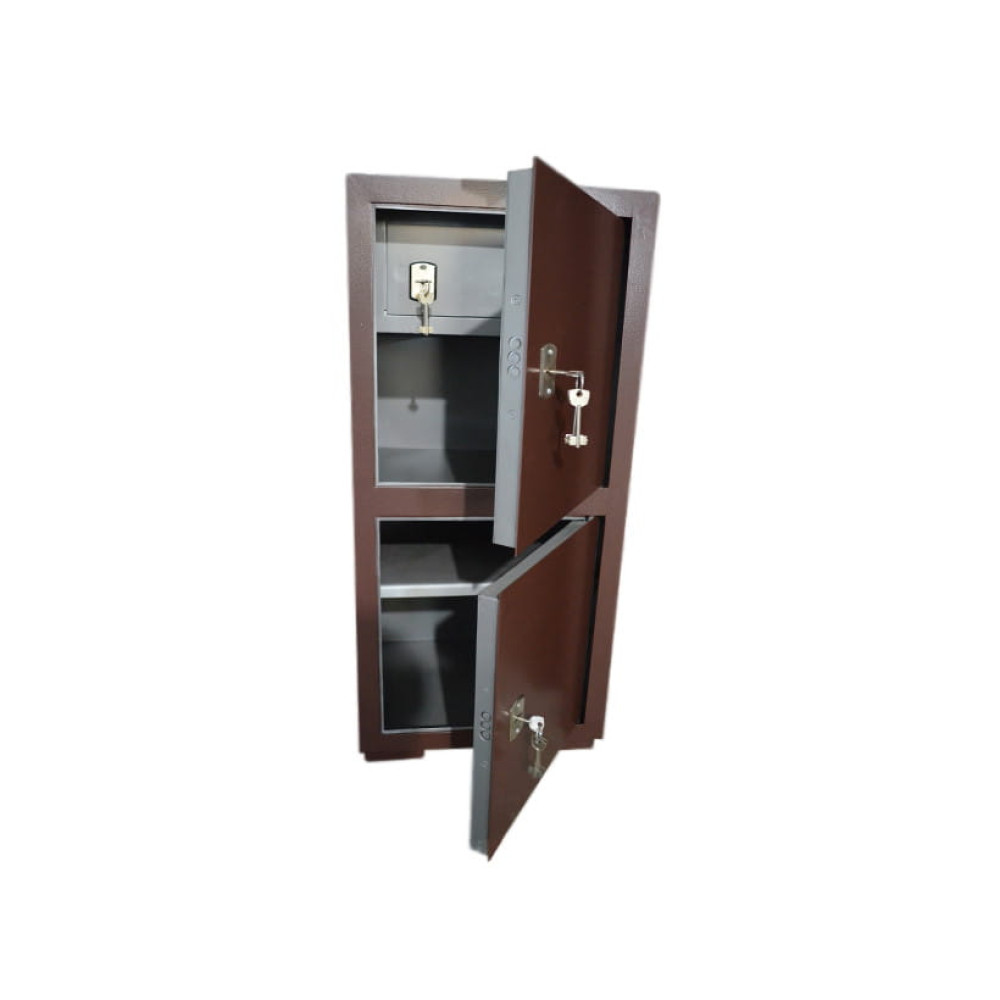 Офисный сейф имеет две отдельные сейфовые ячейки. В верхнем отделении имеется трейзер на всю ширину сейфа 450 мм и высотой 200 мм. В нижнем отделении имеется съемная полка делящая сейф на два отделения.
