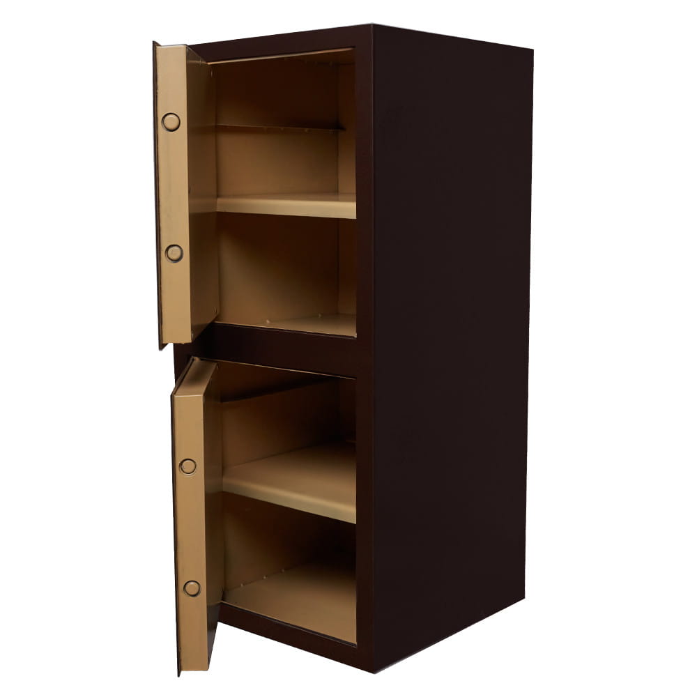 Офисный сейф для удобства имеет два отдельно закрывающихся отделения. Толщина закрываемых дверей по 45,0 мм, также в каждом отдельном сейфе имеется съемная полка, делящая внутреннее отделение сейфа на две секции (для полок предусмотрено два уровня выставления высоты). Сейф установлен на ножках высотой 20 мм.