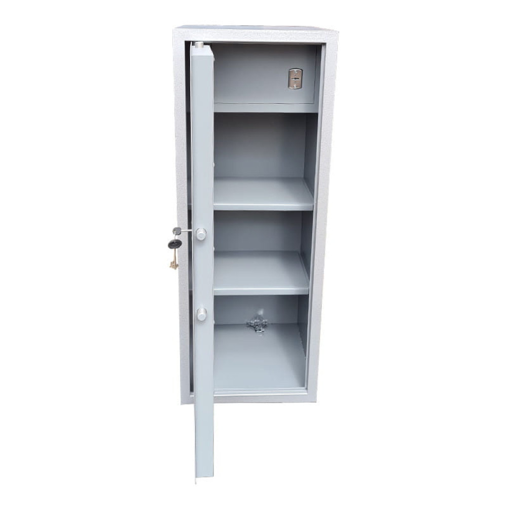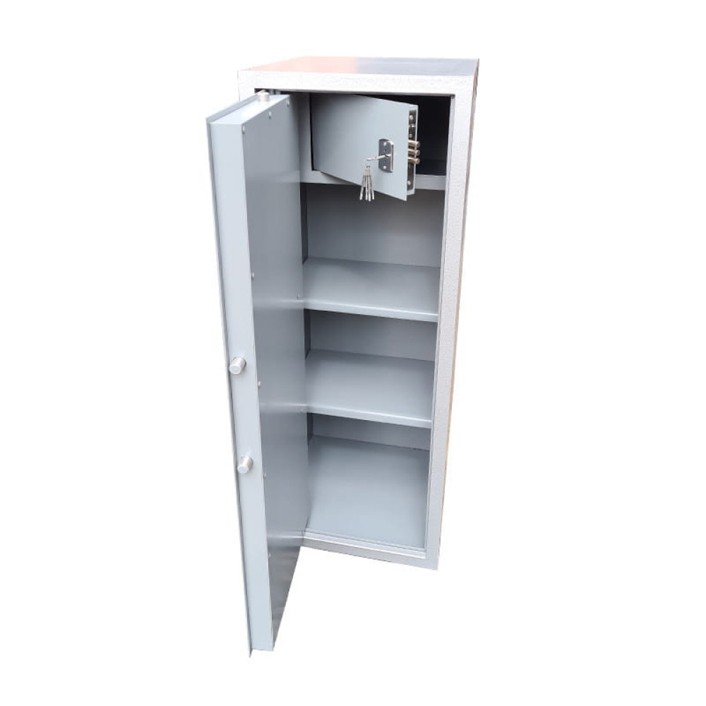 В верхней части офисного сейфа имеется трейзер на всю ширину сейфа 500 мм и высотой 250 мм. Также имеются две съемные полки, делящие сейф на три равных отделения.