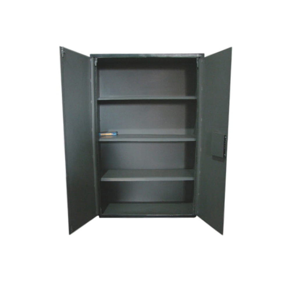 Дверь шкафа двойная. Одна половина двери закрывается на две вертикально установленные защелки, вторая половина двери закрывается на механический ключевой замок сувальдного типа. Замок закрывается на три ригеля диаметром 14 мм каждый. Замок закрытого типа.