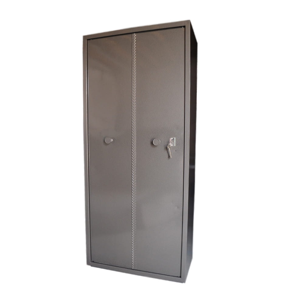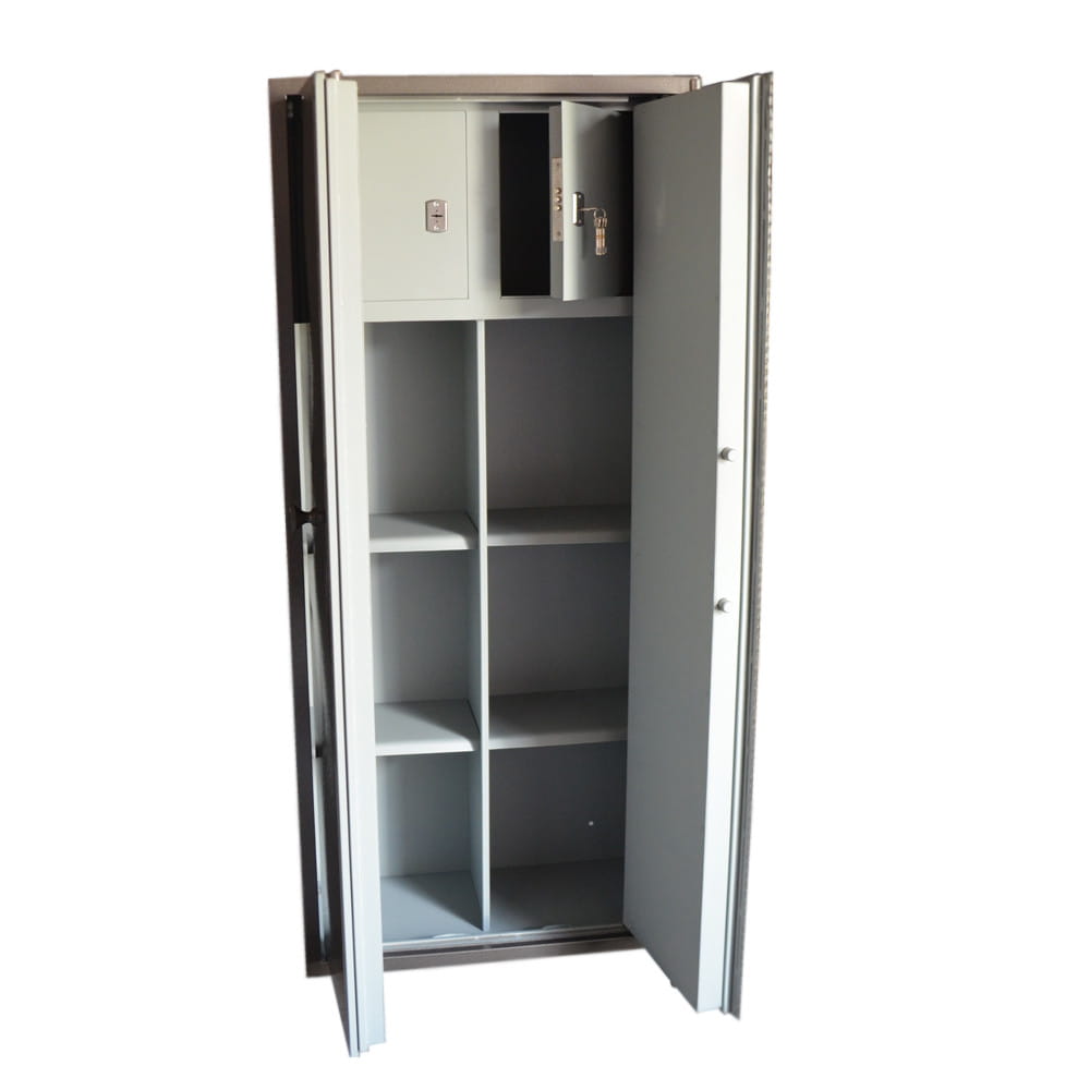Шкаф имеет две одинаковые секции и закрывается двухстворчатой дверью. Левая половина двери запирается на 2 вертикальных ригеля с помощью поворотной ручки, выход в горизонтальной плоскости. Правая половина двери запирается на 4 ригеля в трех направлениях. Диаметр ригеля 22 мм. Замок шкафа сейфовый-механический сувальдного типа, он защитит ваше имущество от посторонних проникновений.