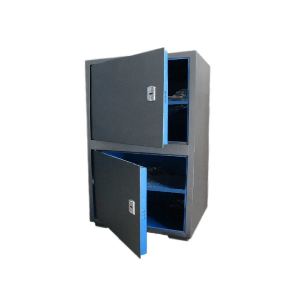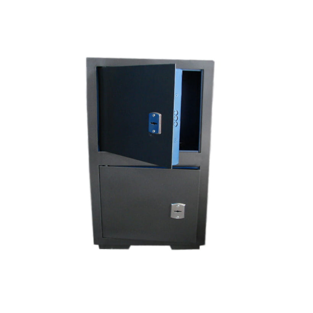 Офисный сейф для удобства имеет два отдельно закрывающихся отделения. Толщина закрываемых дверей по 35,0 мм, также в каждом отдельном сейфе имеется съемная полка, делящая внутреннее отделение сейфа на две секции. Сейф установлен на ножках высотой 20 мм.