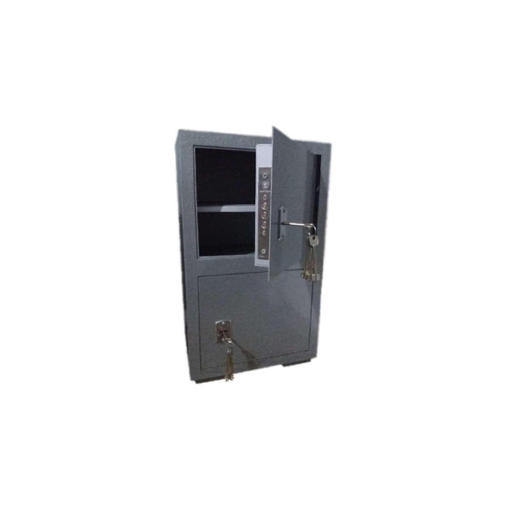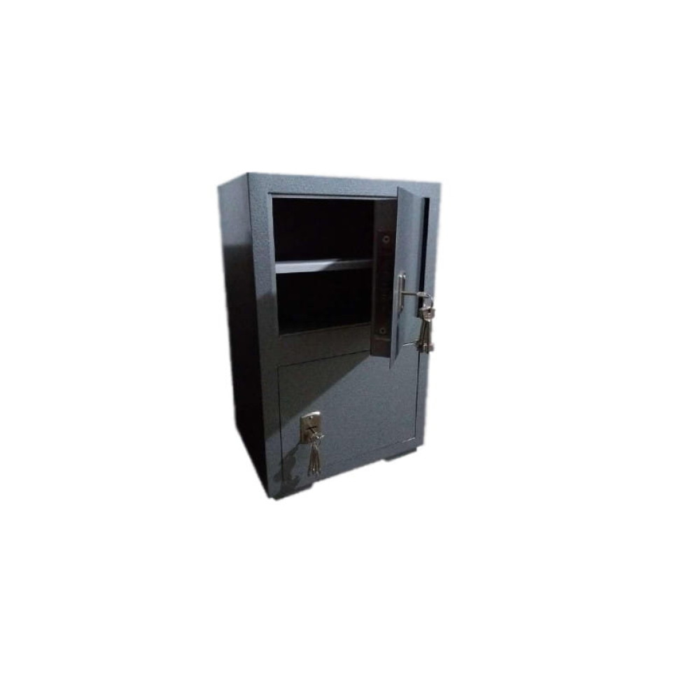 Офисный сейф для удобства имеет два отдельно закрывающихся отделения. Толщина закрываемых дверей по 30,0 мм, также в каждом отдельном сейфе имеется съемная полка, делящая внутреннее отделение сейфа на две секции. Сейф установлен на ножках высотой 20 мм.
