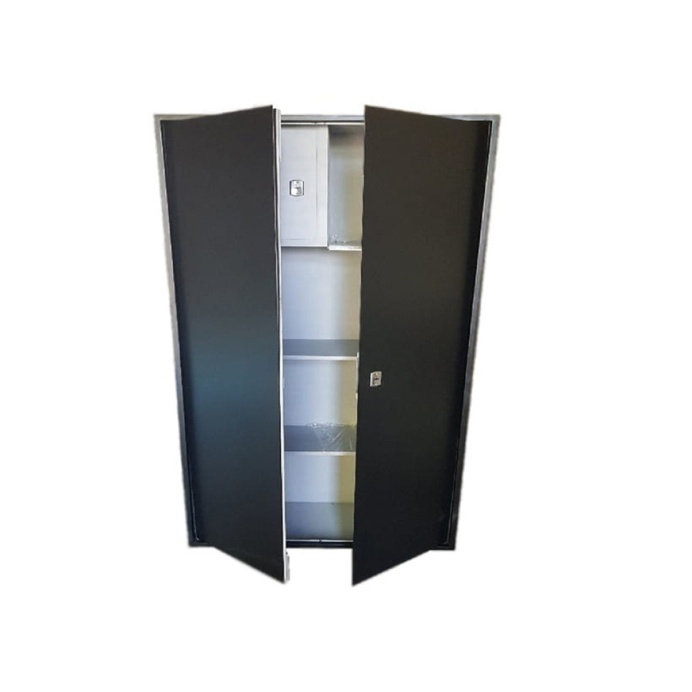 Одна половина двери закрывается на 2 вертикальные защелки, выход в горизонтальной плоскости. Замок шкафа механический ключевой, он защитит ваше имущество от посторонних.