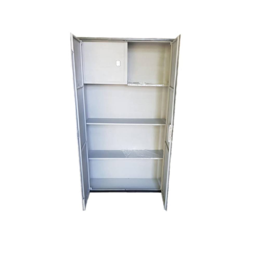 В верхней части шкафа установлен трейзер и запирается на механический замок сувальдного типа (высота 400 мм, ширина 350 мм). Также имеются три дополнительные съемные полки.