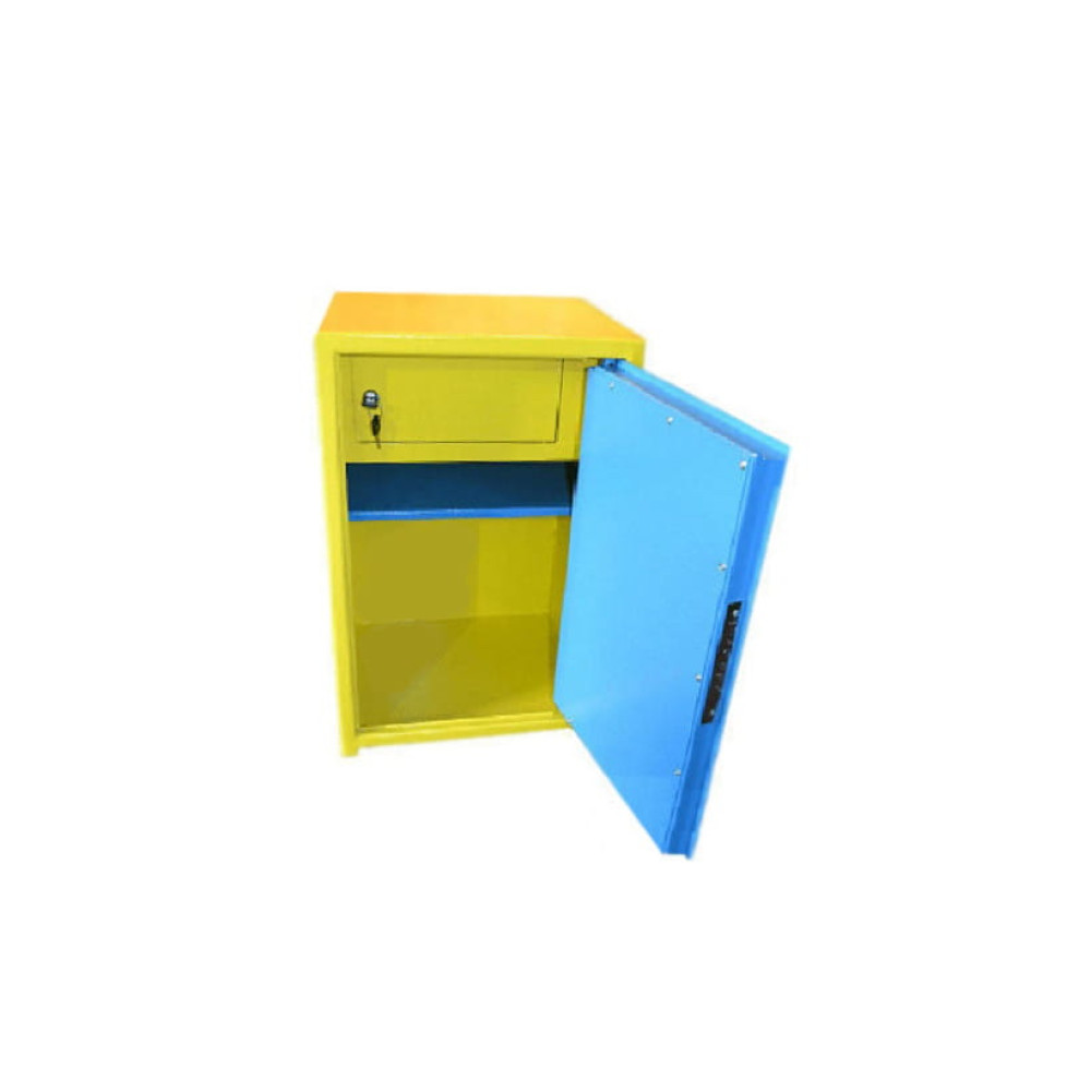 Офисный сейф окрашен краской с молотковым и перламутровым эффектом. Покрытие износостойкое, удобное в эксплуатации, защищает сейф от коррозии. Стандартный цвет сине-желтый. Возможно окрашивание в другие цвета по согласованию.