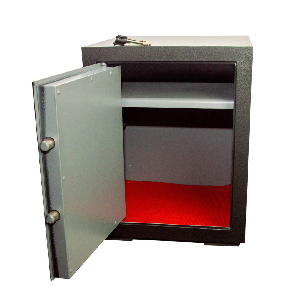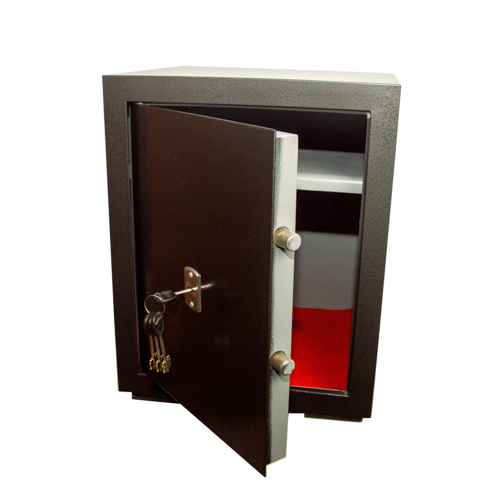 Офисный сейф предназначен для хранения денег, документов и ценностей. Корпус сейфа усилен полосой со стороны двери, что придает конструкции дополнительную жесткость и повышает уровень устойчивости ко взлому. Двери данного сейфа выполнены заподлицо. Конструкция корпуса выполнена из листов стали толщиной 2,0 мм (корпус) и 3,0 мм (дверная плита).
