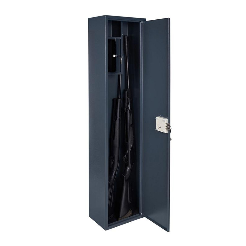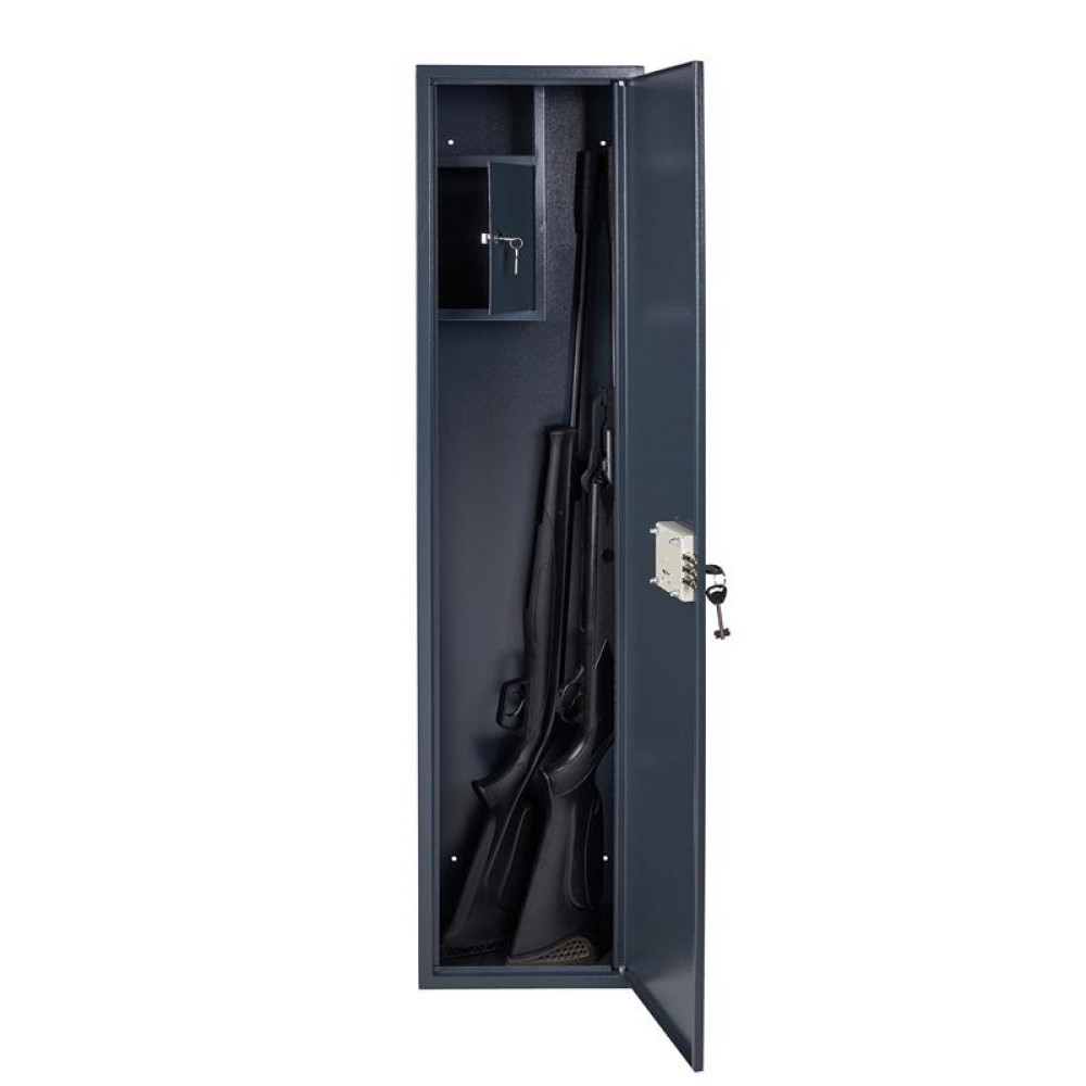 Оружейный сейф  ОШМ-135КТ  комплектуется ключевым сейфовым замком, в комплекте к замку 2 ключа. Внутри сейфа установлено кассовое отделение (трейзер) для патронов, в комплекте к нему 2 ключа и несъемная полкой над ним. Сейф предназначен для хранения оружия высотой до 1320мм.