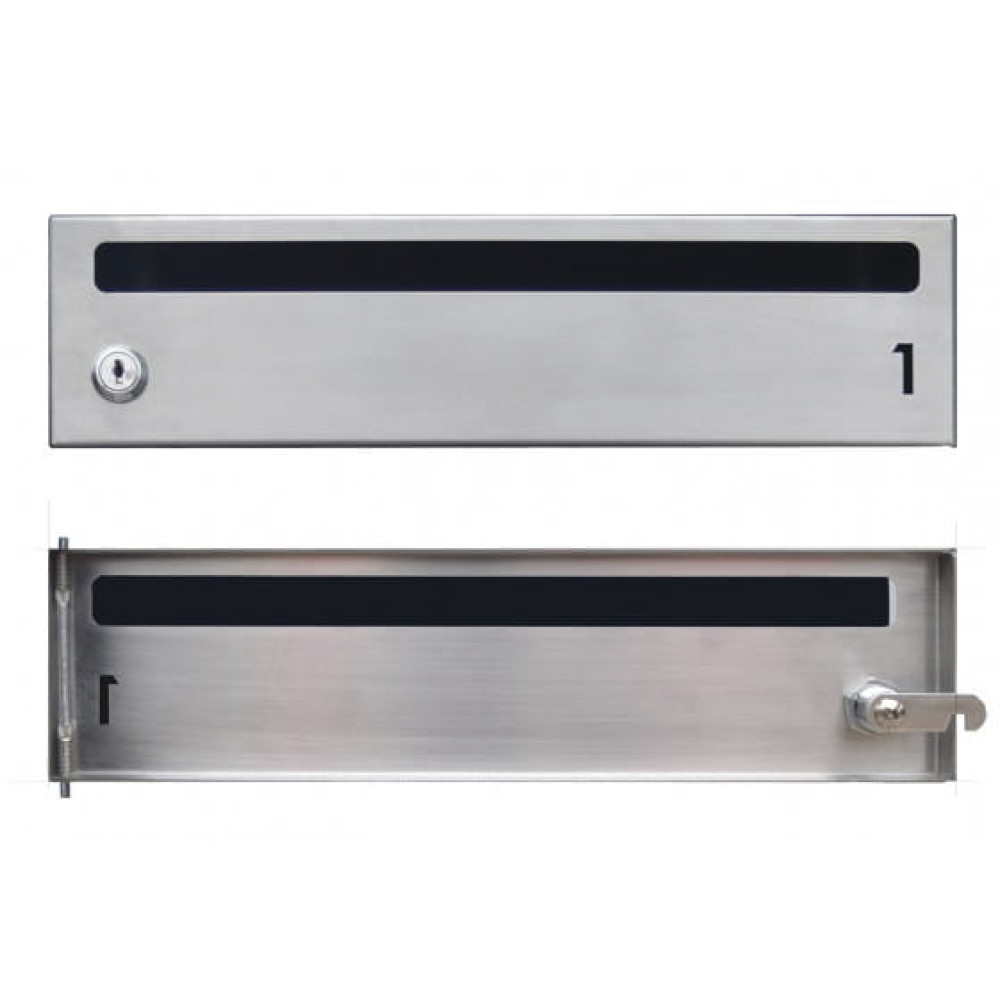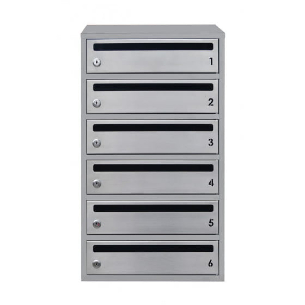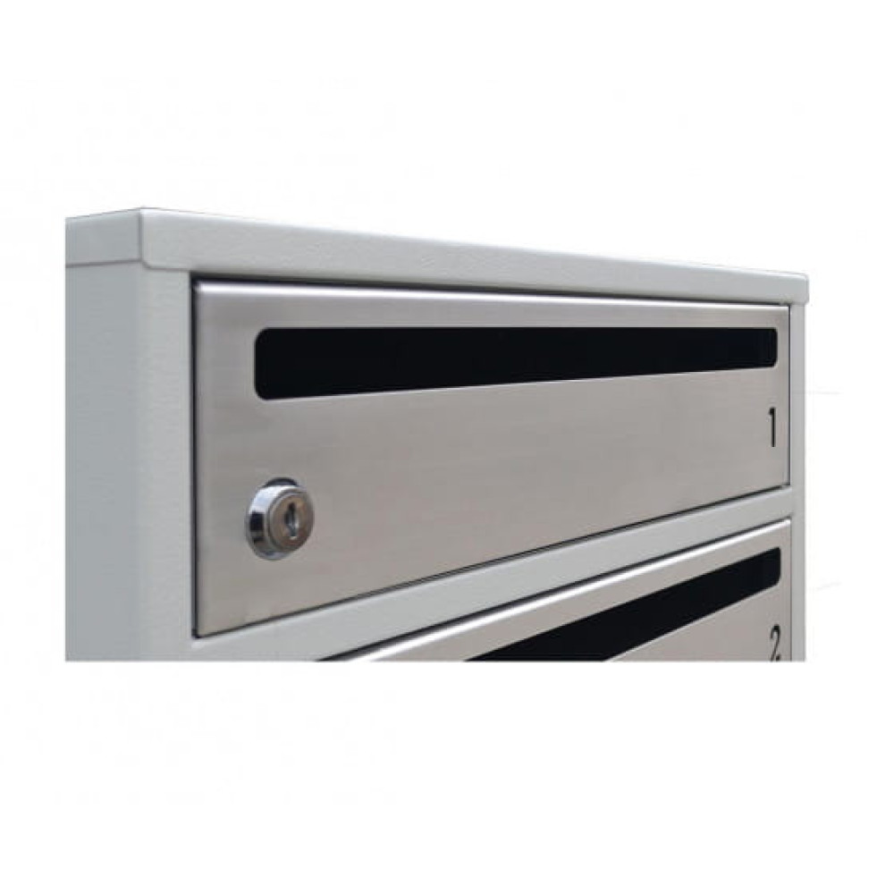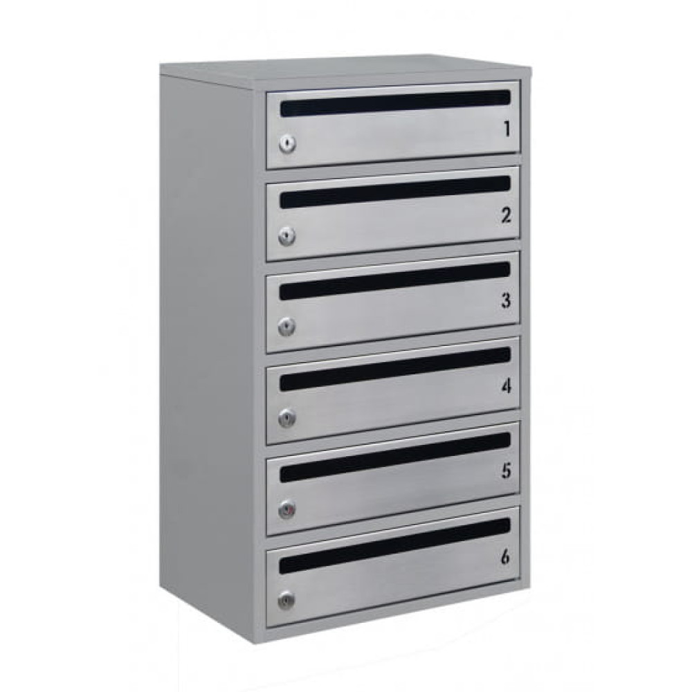 Почтовый ящик E2-F рассчитан на 6 квартир и имеет косые секции. Корпус изготовлен из металла толщиной 0,7 мм и покрыт порошковой краской серого цвета (RAL 7035). Дверцы изготовлены из нержавейки и имеют вырезанные номер квартиры и щель для укладки корреспонденции. Каждая секция закрывается на замок, к каждому замку – 2 ключа в комплекте. Размеры почтового ящика – 675x390x250 мм.