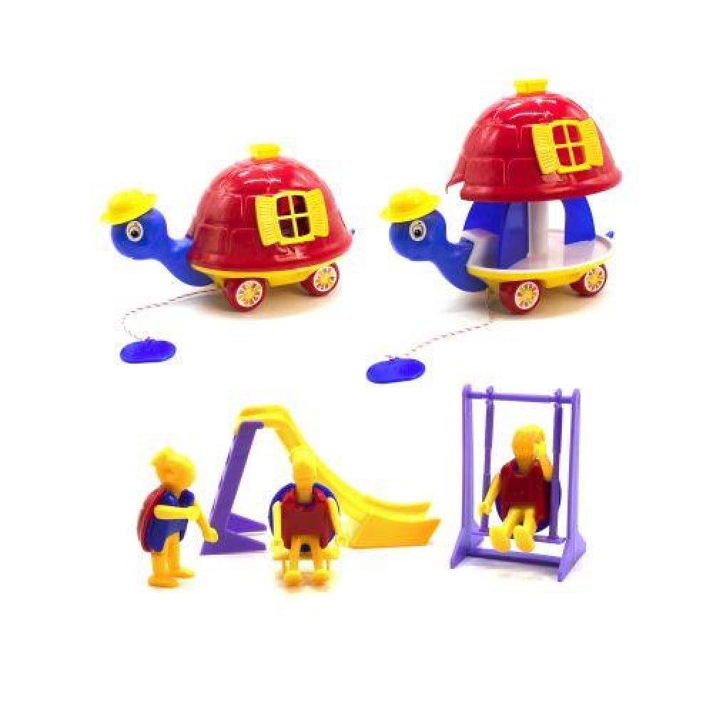 Яркая каталка в виде черепашки, у которой внутри панциря находится домик. Если нажать черепашке на хвостик - домик подпрыгнет вверх, и внутри окажется площадка с игрушками. В комплекте: 3 фигурки черепашек (7 х 4 см) с подвижными ручками, ножками и головой, табуретка, горка и качелька. При движении черепаха-каталка качает головой. Возить каталку можно за удобную верёвочку с ручкой. _