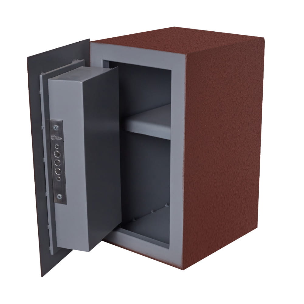 Сейф мебельный окрашен краской с молотковым и перламутровым эффектом. Покрытие износостойкое, удобное в эксплуатации, защищает сейф от коррозии. Стандартный цвет: коричневый. Возможно окрашивание в другие цвета по согласованию.