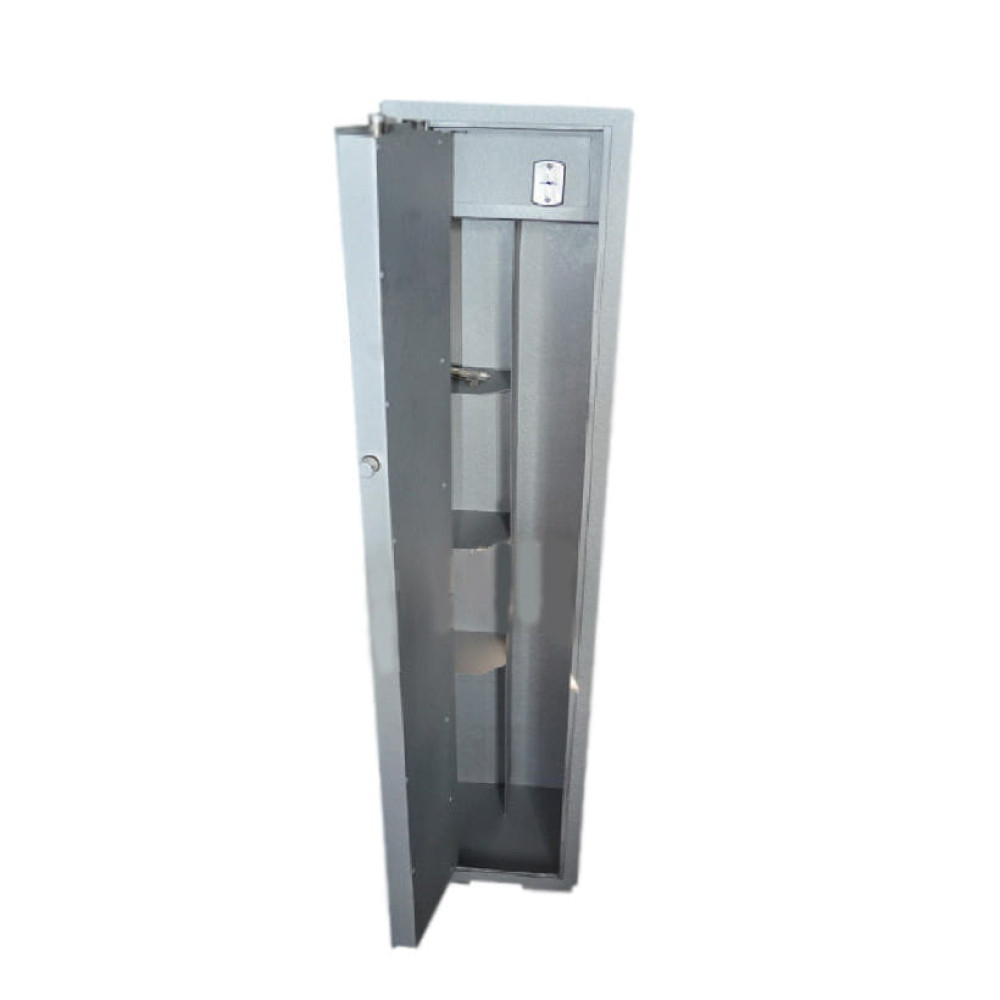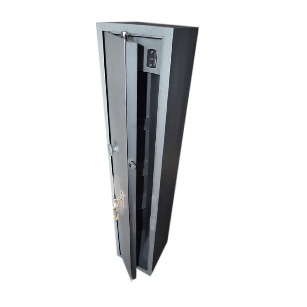 Корпус оружейного сейфа усилен полосой со стороны двери, что придает конструкции дополнительную жесткость и повышает уровень устойчивости ко взлому. Дверь данного сейфа выполнена заподлицо. Конструкция корпуса выполнена из листов стали толщиной 3,0 мм (корпус) и 3,0 мм (дверная плита). Толщена двери 43 мм.