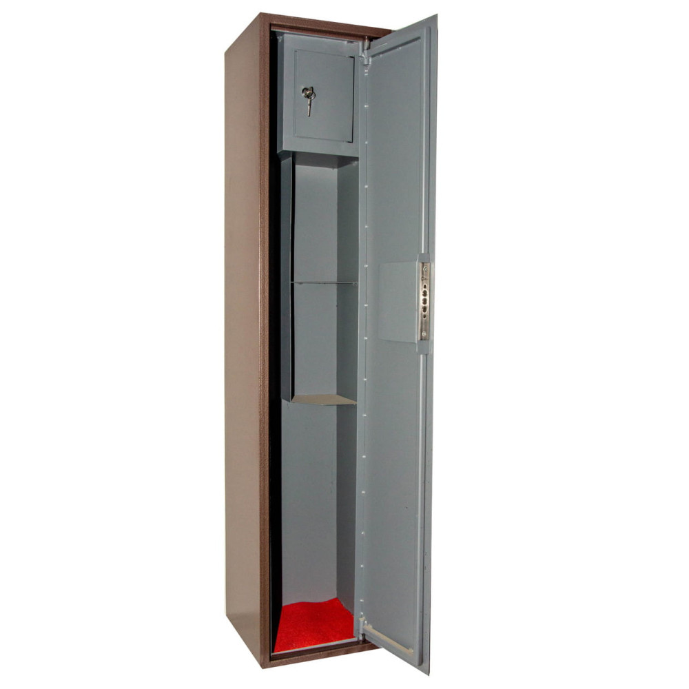 Корпус оружейного сейфа усилен профильной трубой со стороны двери, что придает конструкции дополнительную жесткость и повышает уровень устойчивости ко взлому. Дверь данного сейфа утоплена, что также увеличивает его надежность. Конструкция корпуса выполнена из листов стали толщиной 2,0 мм (корпус) и 3,0 мм (дверная плита). Дверь сейфа одинарная усилена по периметру профильной трубой, замок закрытого типа.