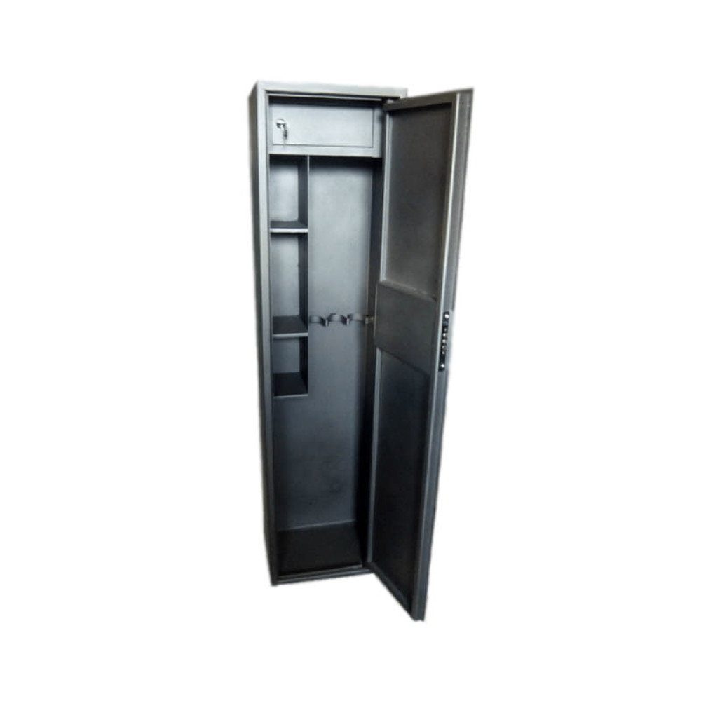 Корпус оружейного сейфа усилен профильной трубой со стороны двери, что придает конструкции дополнительную жесткость и повышает уровень устойчивости ко взлому. Дверь данного сейфа утоплена, что также увеличивает его надежность. Конструкция корпуса выполнена из листов стали толщиной 2,0 мм (корпус) и 3,0 мм (дверная плита).