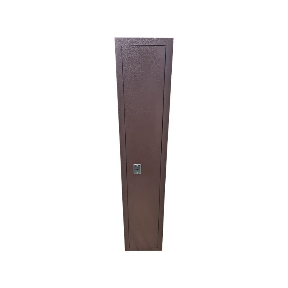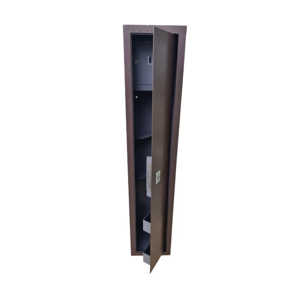 Корпус оружейного сейфа усилен полосой со стороны двери, что придает конструкции дополнительную жесткость и повышает уровень устойчивости ко взлому. Дверь данного сейфа установлена заподлицо. Конструкция корпуса выполнена из листов стали толщиной 2,0 мм (корпус) и 3,0 мм (дверная плита).
