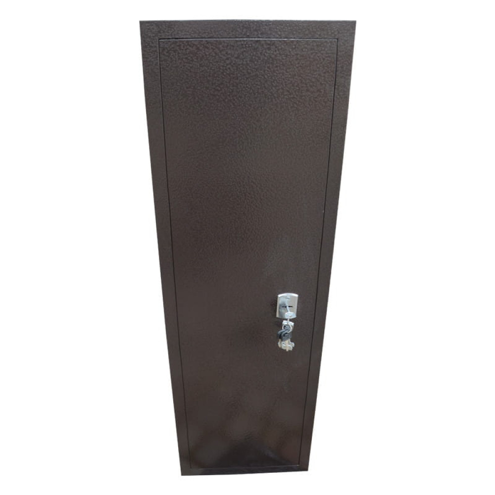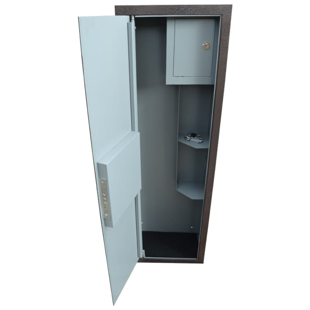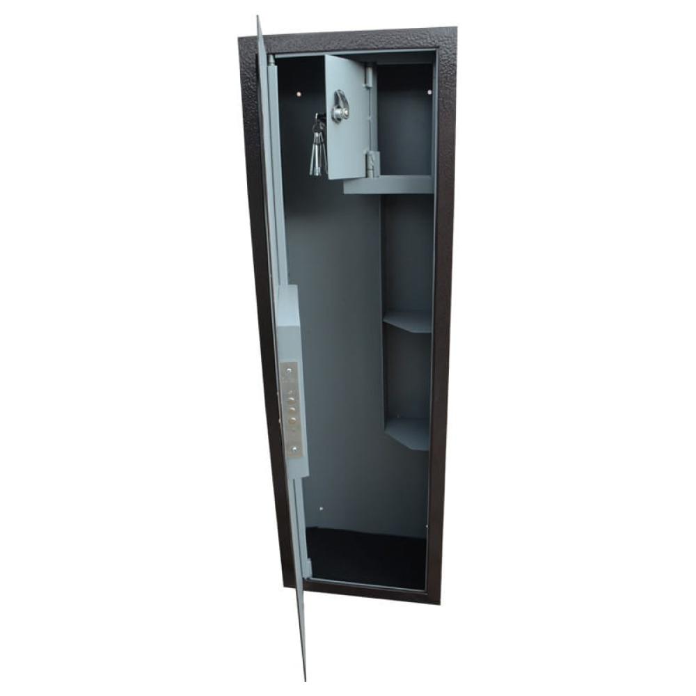 Корпус оружейного сейфа усилен полосой со стороны двери, что придает конструкции дополнительную жесткость и повышает уровень устойчивости ко взлому. Дверь данного сейфа выполнена заподлицо. Конструкция корпуса выполнена из листов стали толщиной 2,0 мм (корпус) и 3,0 мм (дверная плита).
