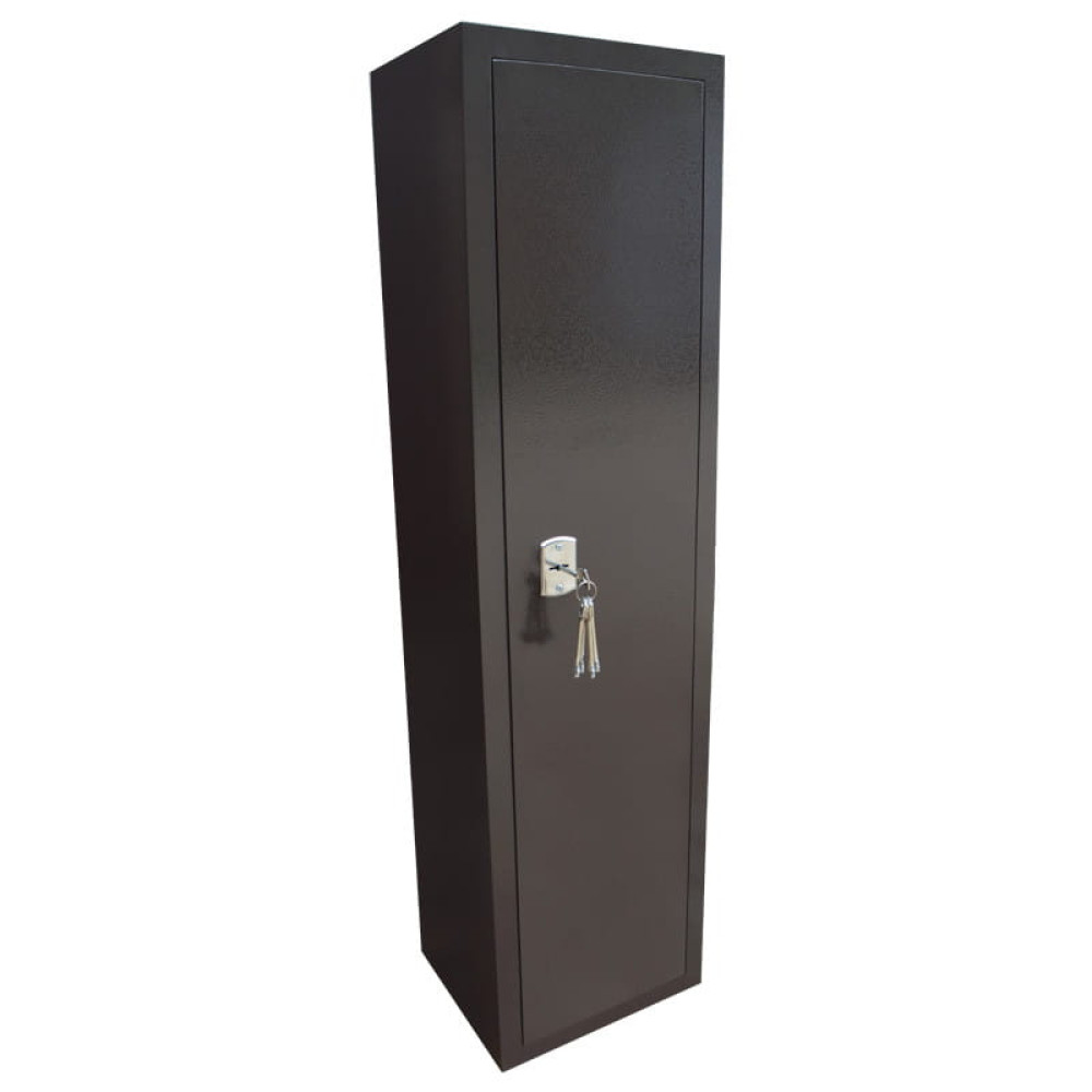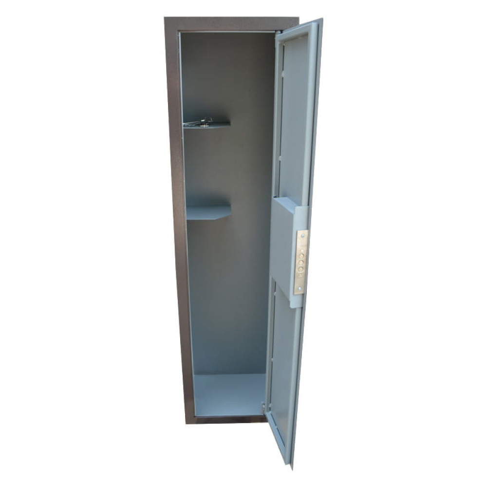 Корпус оружейного сейфа усилен полосой со стороны двери, что придает конструкции дополнительную жесткость и повышает уровень устойчивости ко взлому. Дверь данного сейфа установлена заподлицо. Конструкция корпуса выполнена из листов стали толщиной 2,0 мм (корпус) и 2,0 мм (дверная плита).