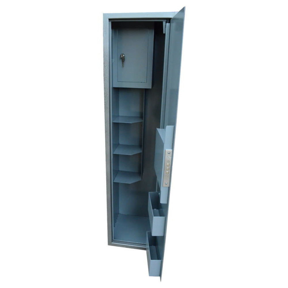 Корпус оружейного сейфа усилен профильной трубой со стороны двери, что придает конструкции дополнительную жесткость и повышает уровень устойчивости ко взлому. Дверь данного сейфа утопленного типа, что также защищает сейф от взлома. Конструкция корпуса выполнена из листов стали толщиной 2,0 мм (корпус) и 3,0 мм (дверная плита).