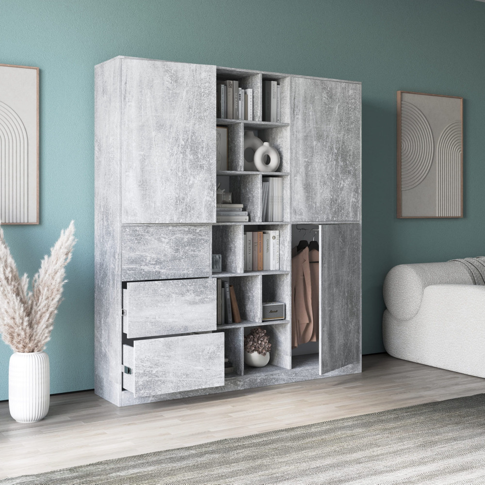 Современный распашной шкаф с полочками и ящиками Бетон