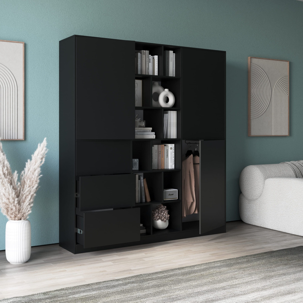 Современный распашной шкаф с полочками и ящиками Черный